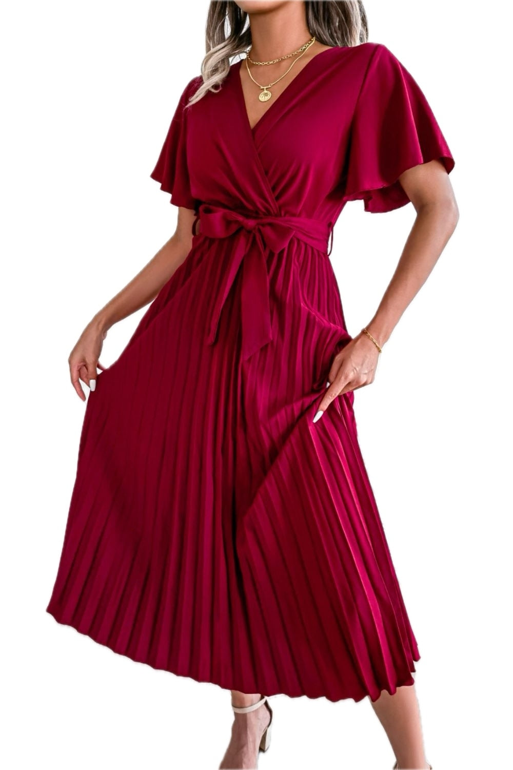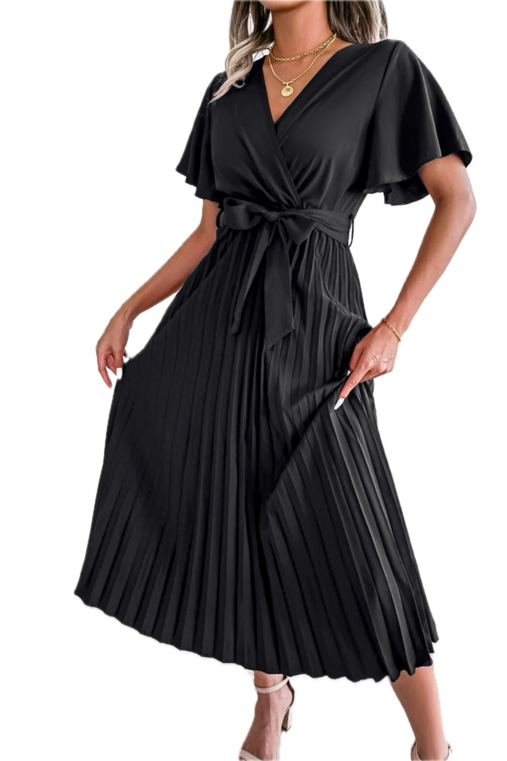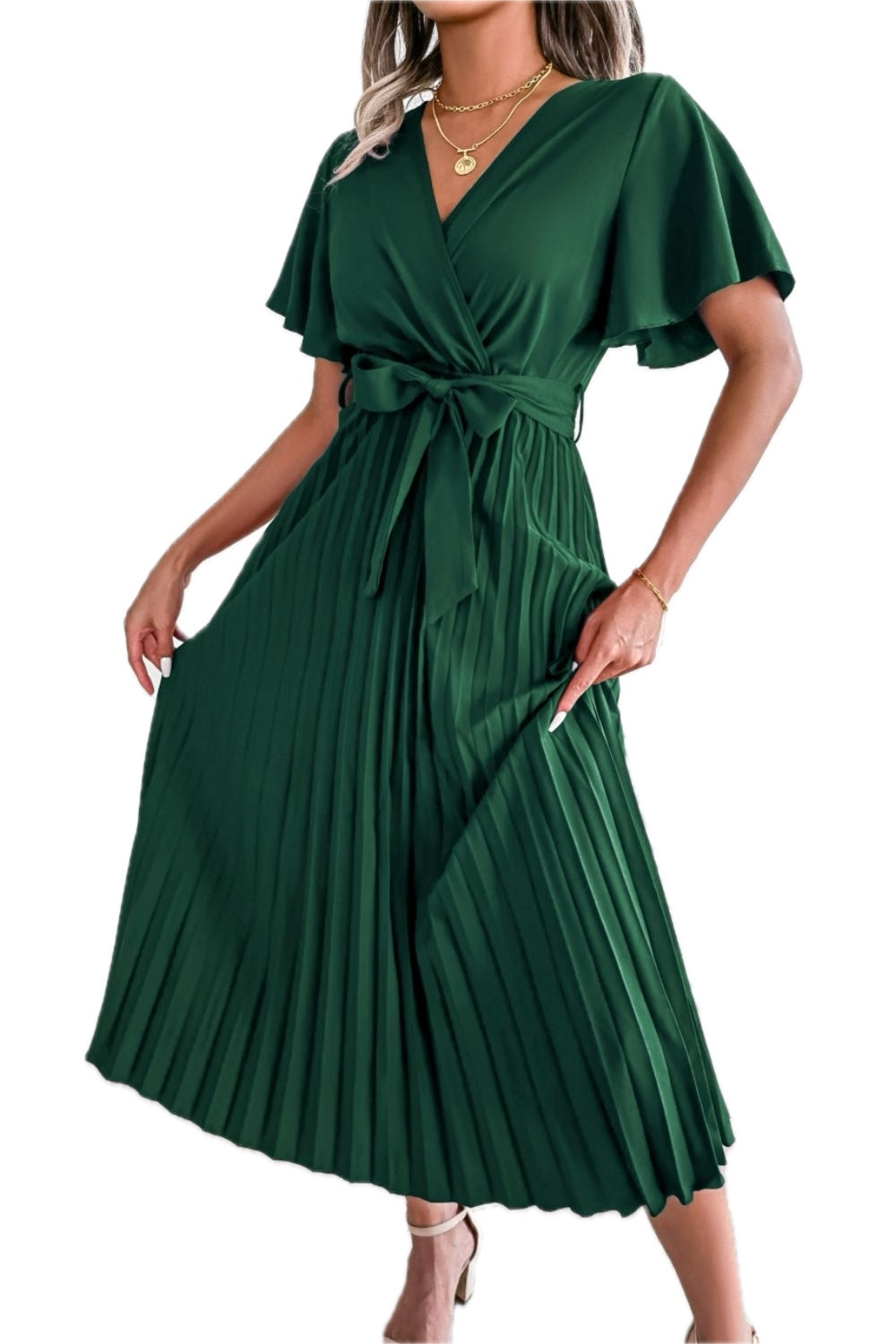 Women's Pleated Flutter Sleeve Belted Dress Midi Length Surplice Neckline Casual Minimalist Style 100% Acrylic Fabric