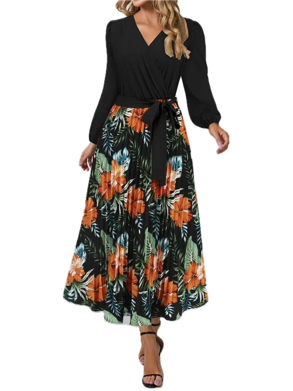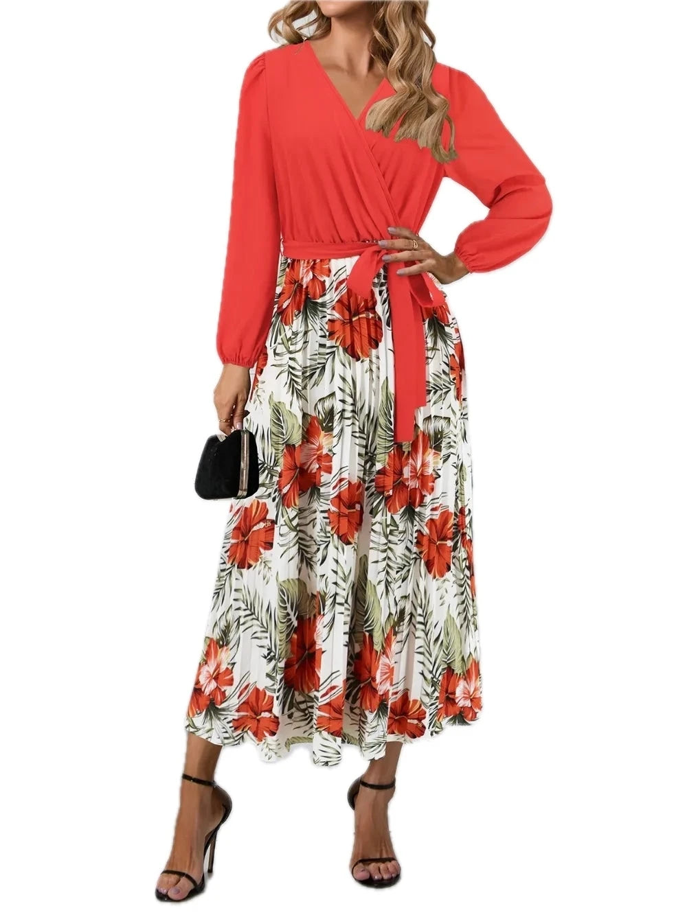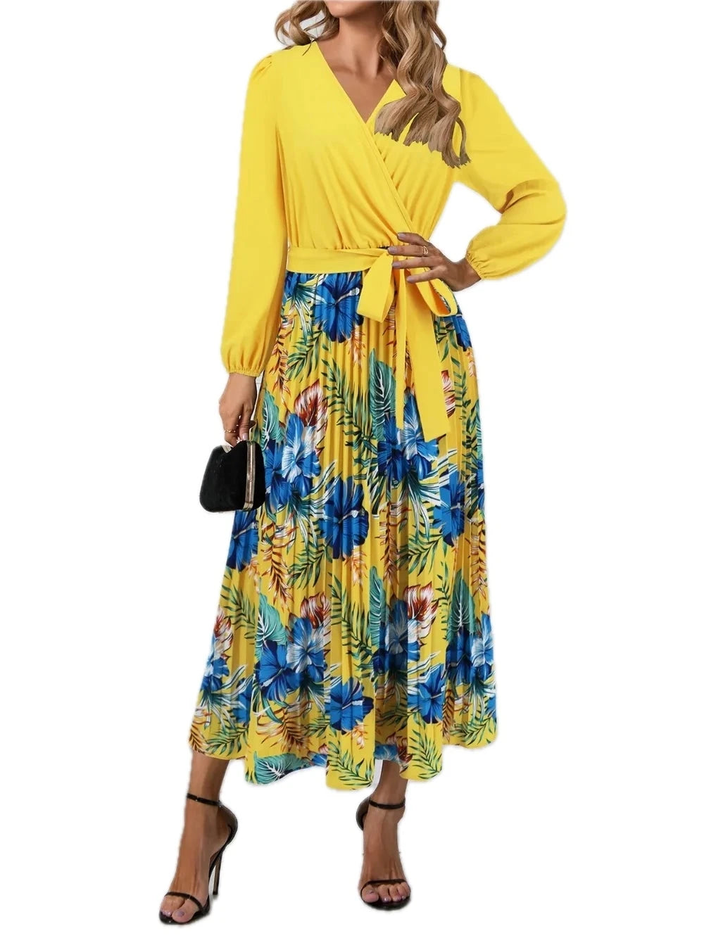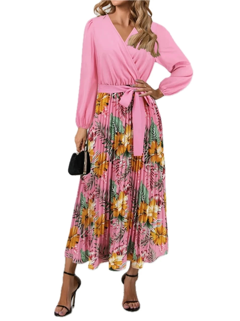 Women's Pleated Printed Surplice Long Sleeve Dress 100% Polyester Flowing Silhouette for Day to Night Wear Style