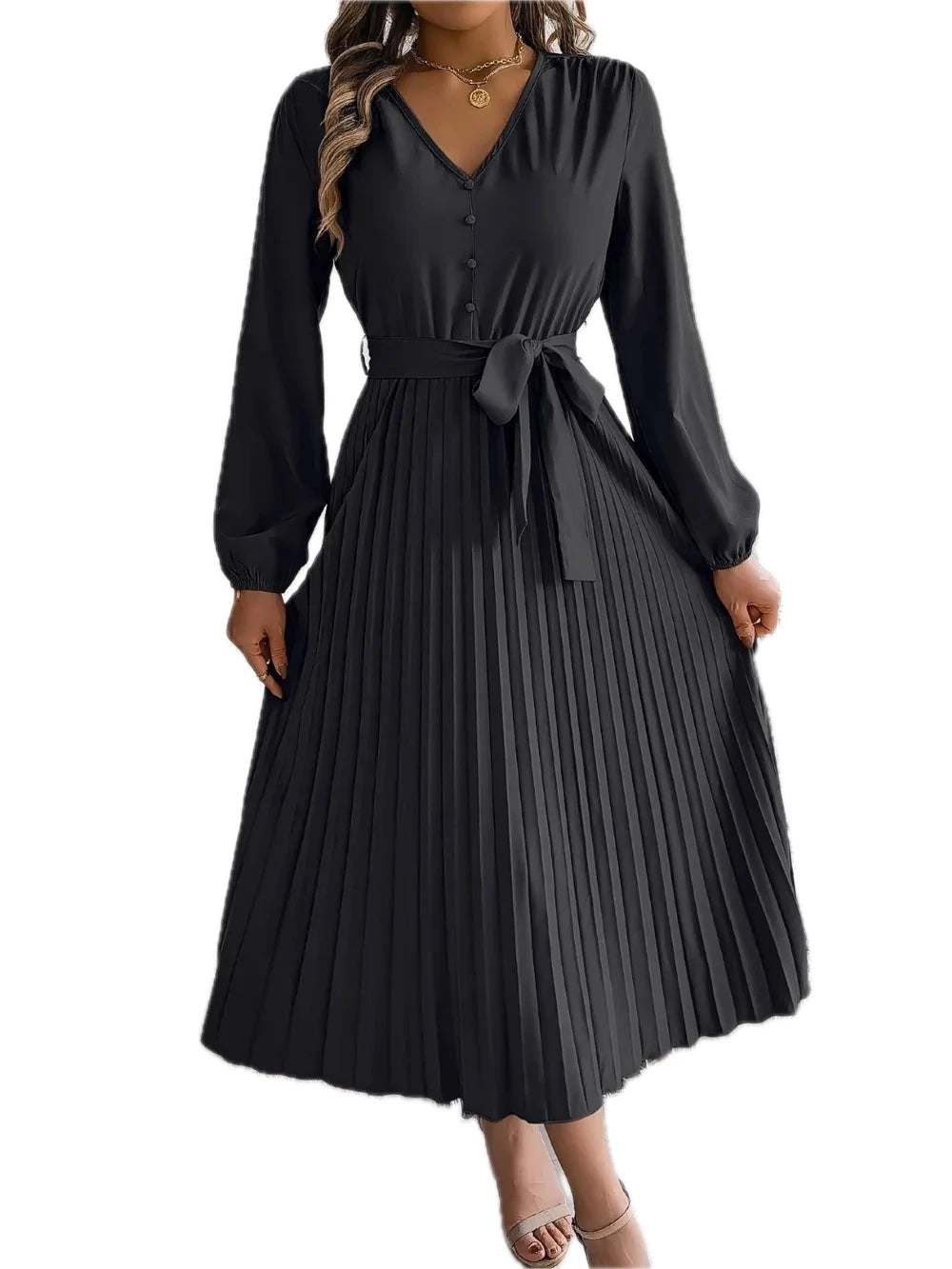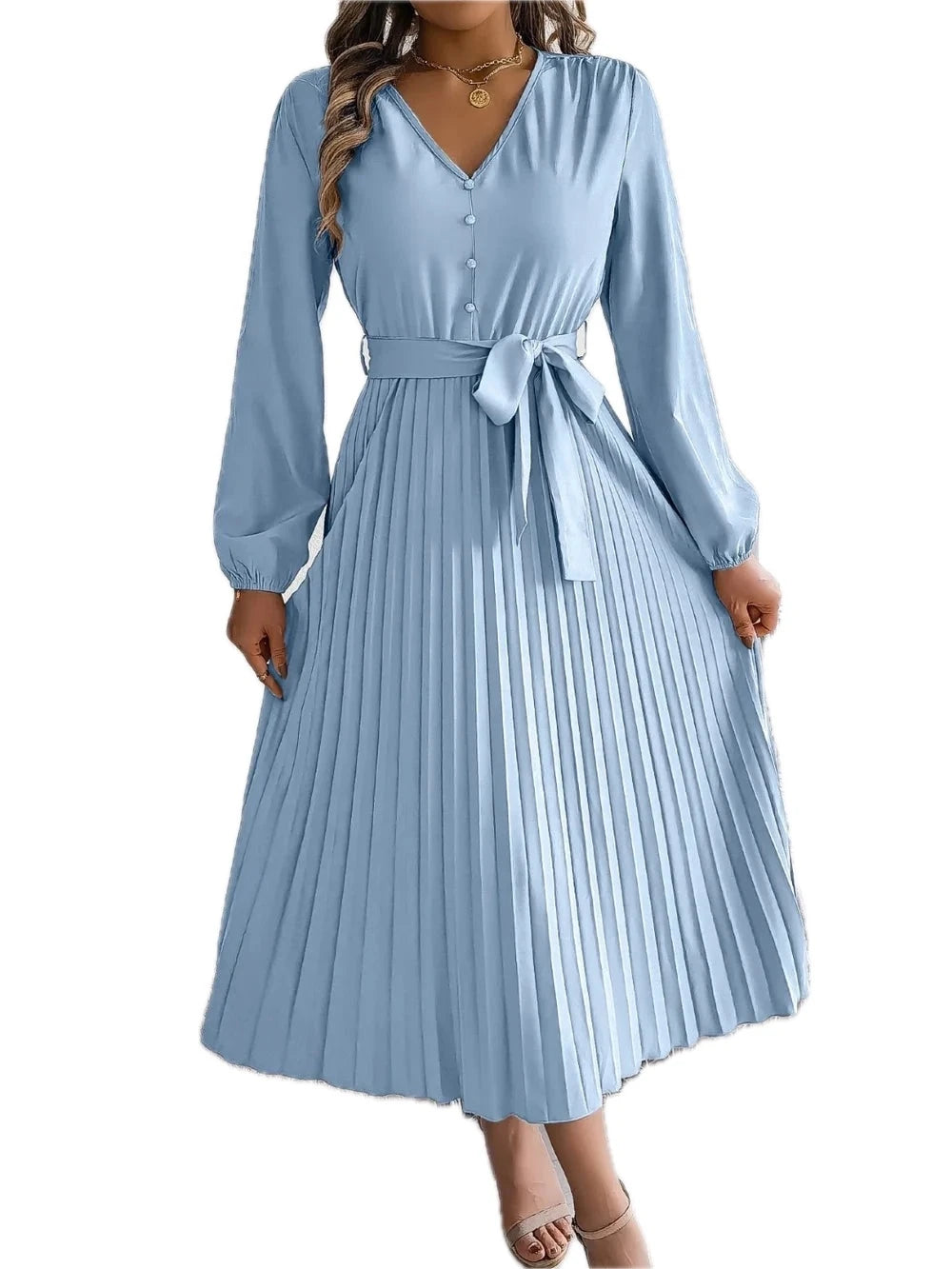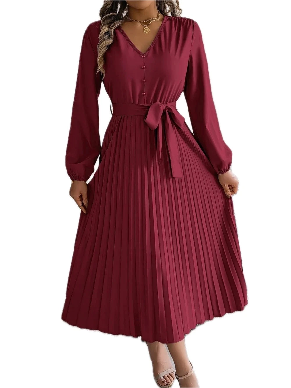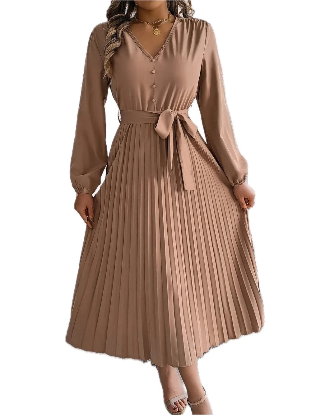 Women's Pleated Tied V-Neck Long Sleeve Dress with Sheer Detail and Stretch 95% Polyester 5% Elastane Fabric Line