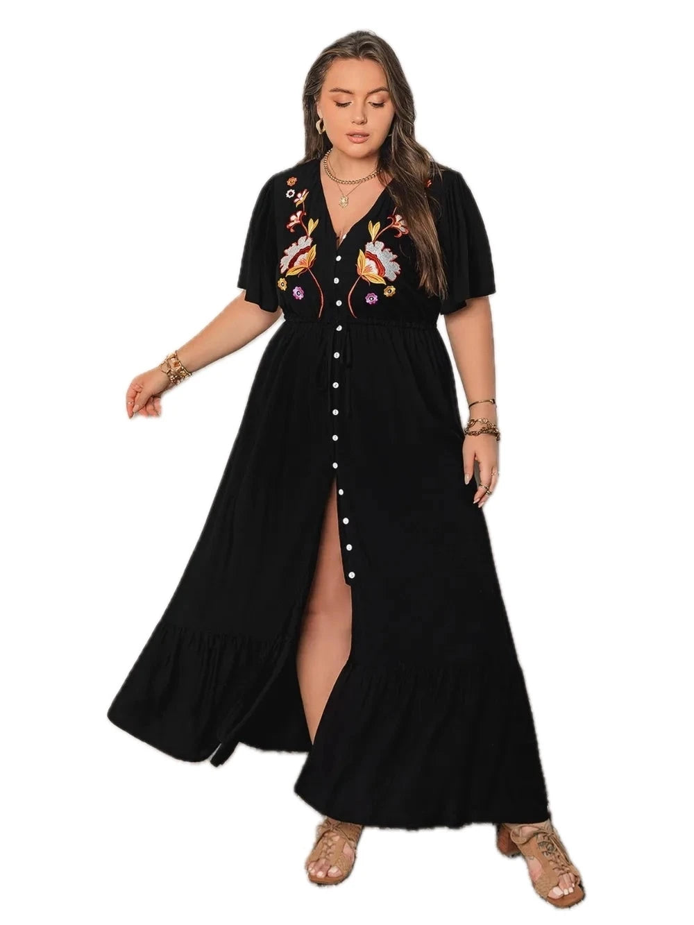 Women's Plus Size Embroidered V Neck Flutter Sleeve Maxi Dress with Flowing Silhouette for Everyday Wear 100% Viscose