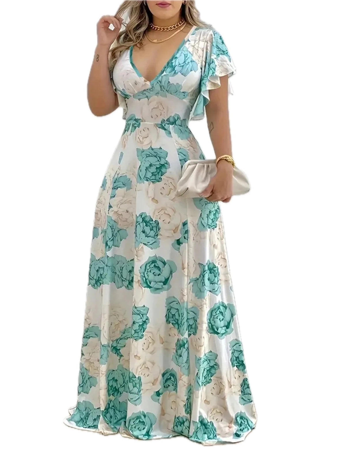 Women's Plus Size Floral Print V Neck Maxi Dress with Flutter Sleeves 100% polyester fabric for a flowing silhouette