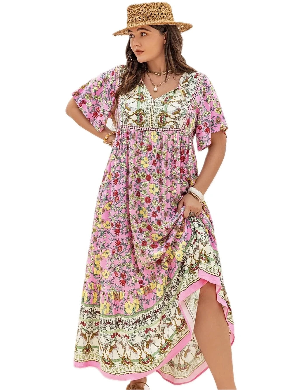 Women's Plus Size Floral Tie Neck Flutter Sleeve Maxi Dress 100% viscose lightweight elegant vacation wear easy care