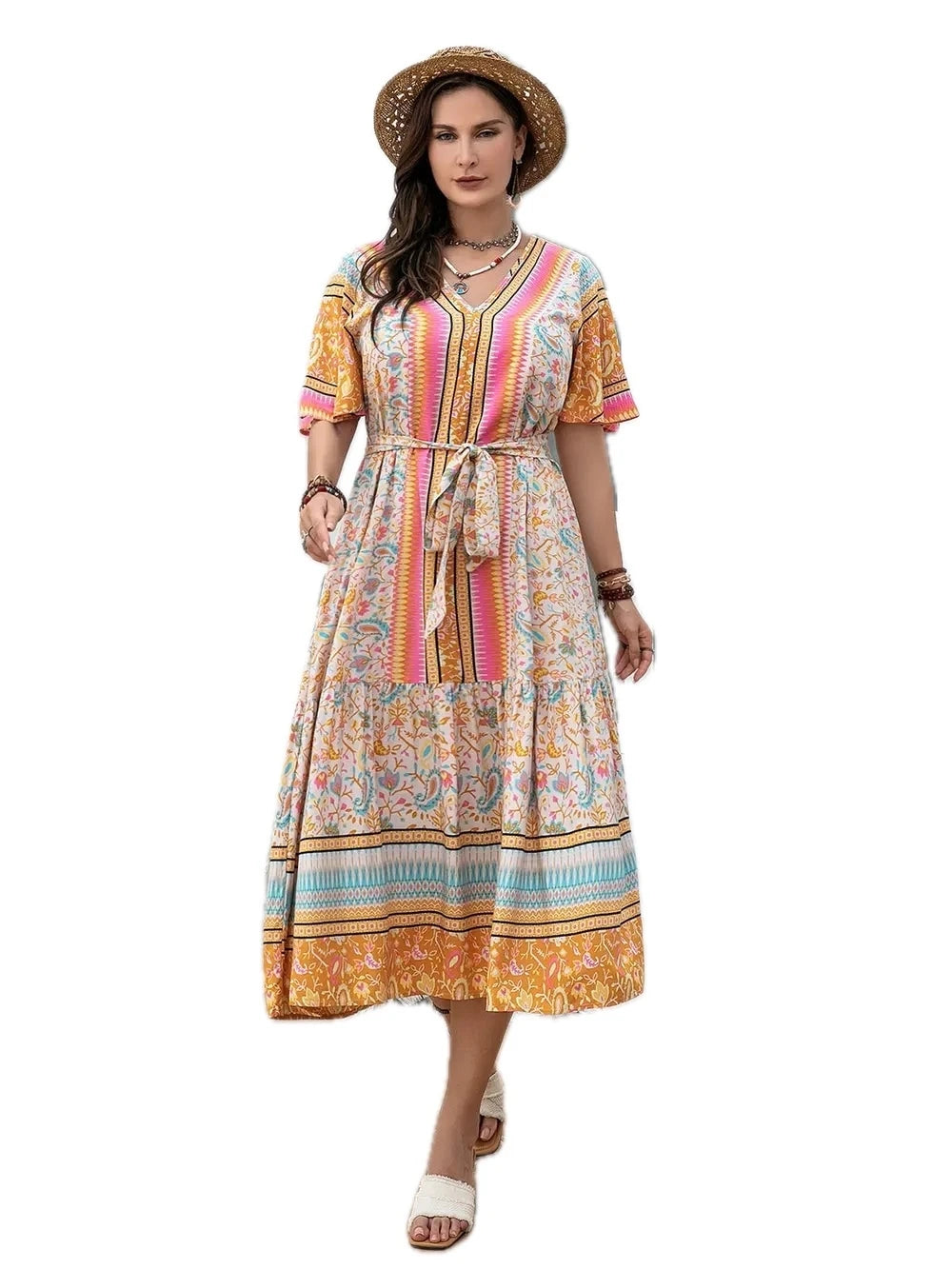 Women's Plus Size Floral Tied Short Sleeve Midi Dress in Viscose 100% Fabric for Elegant Casual Summer Outfit Style