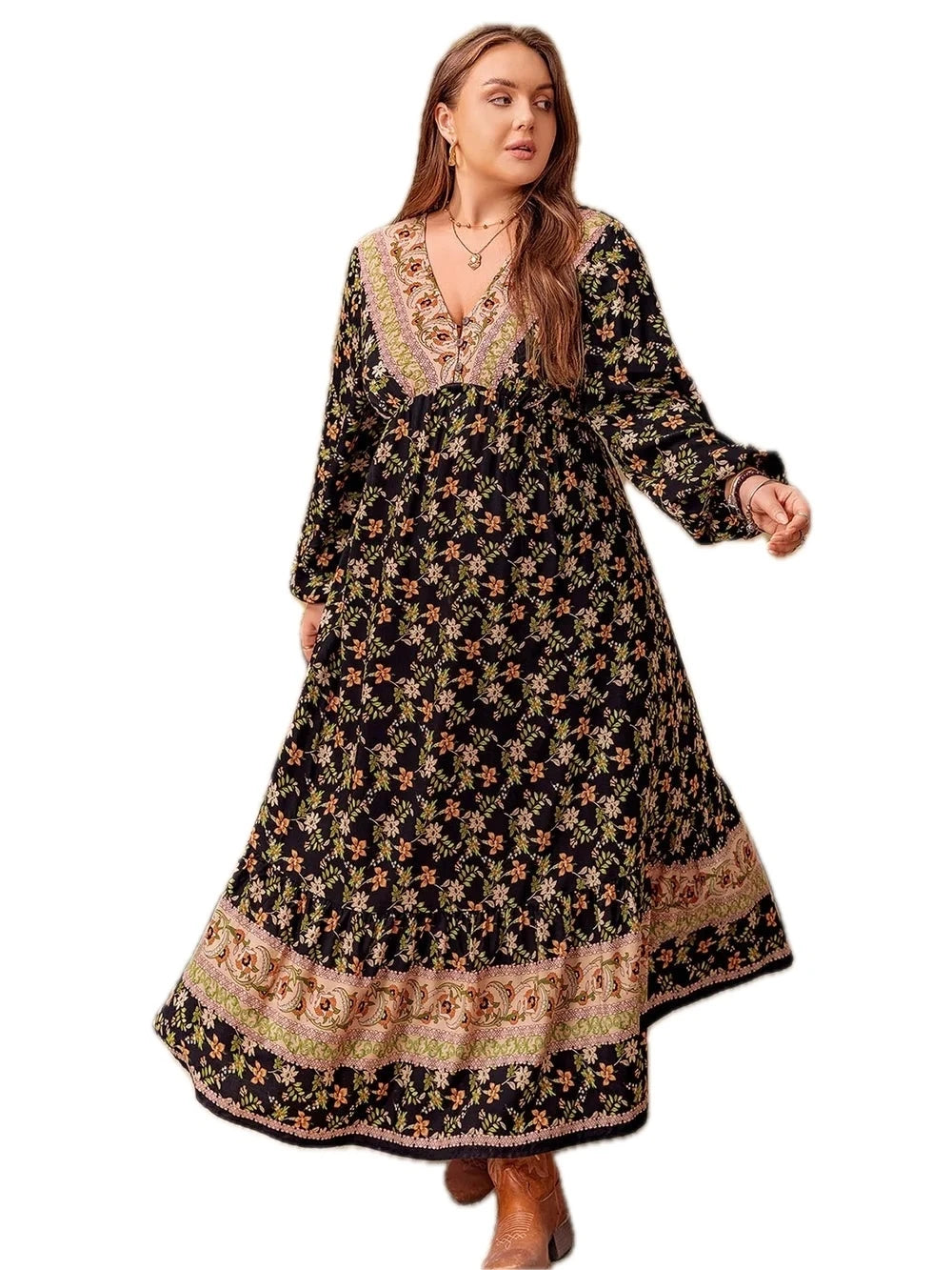 Women's Plus Size Floral V Neck Balloon Sleeve Dress 100% viscose Comfortable Flowing Fit For Everyday Wear Lightweight
