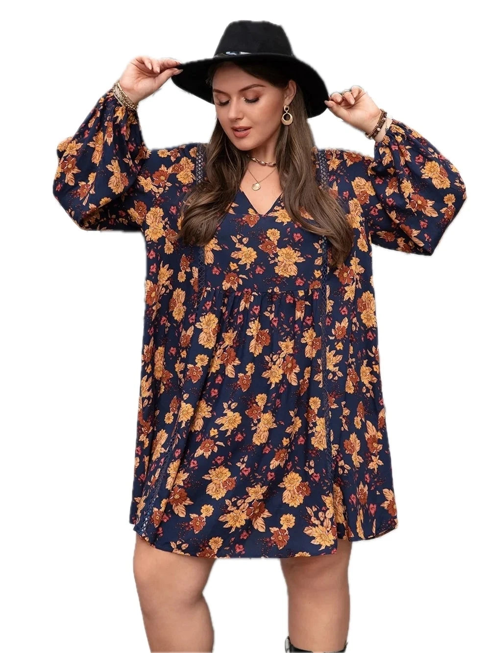 Women's Plus Size Floral V Neck Balloon Sleeve Dress 100% viscose Lightweight Flowing Fabric Perfect for Day Wear