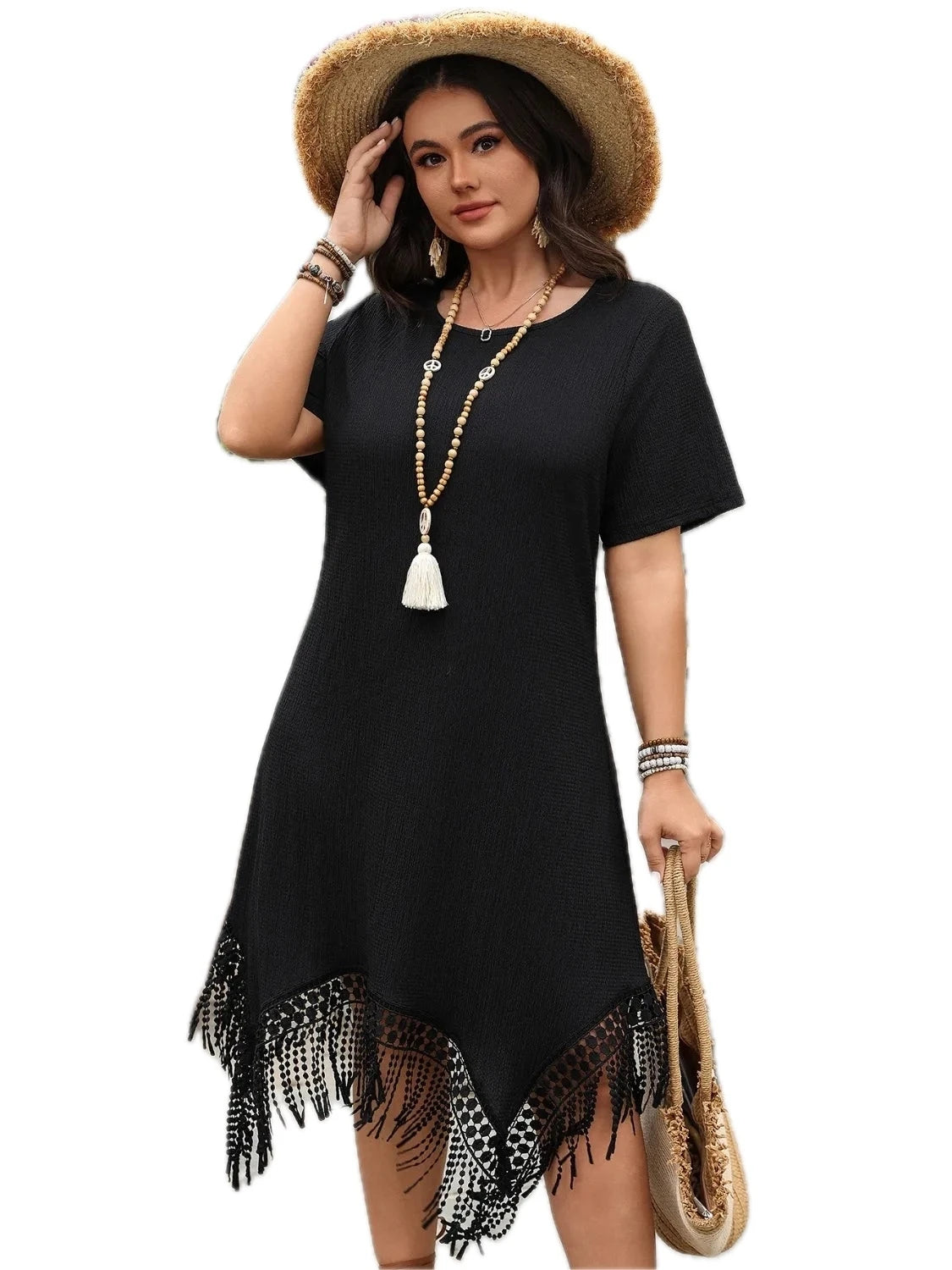 Women's Plus Size Fringe Round Neck Short Sleeve Midi Tee Dress with 97% Polyester and 3% Elastane for Comfort