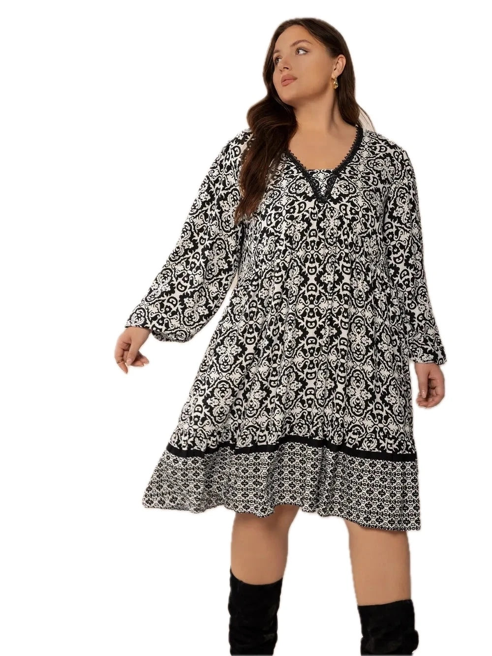 Women's Plus Size Lace Detail Printed Balloon Sleeve Dress with Ruched Bodice and Sheer Accents All Day Comfort