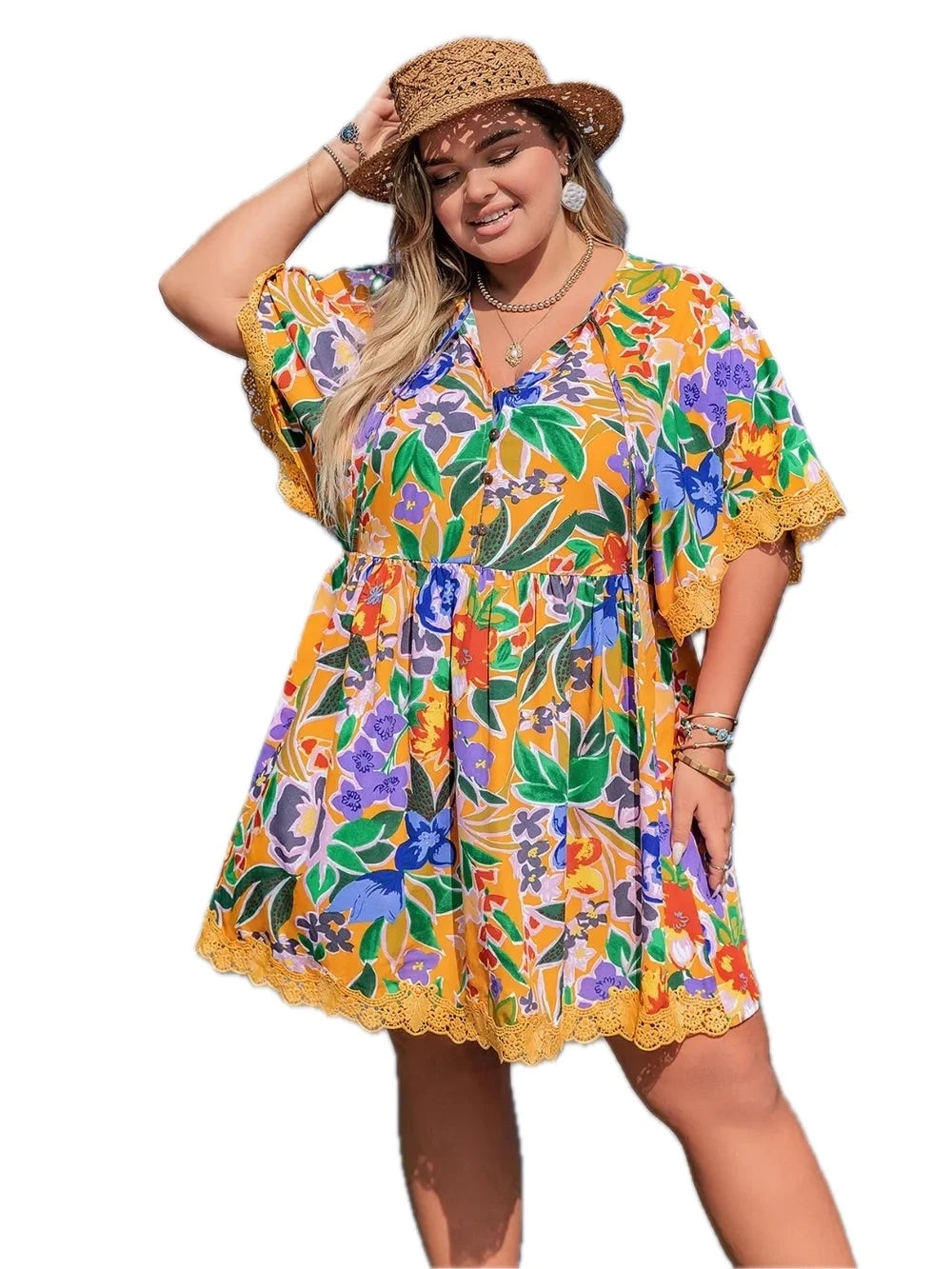 Women's Plus Size Lace Detail Printed Tie Neck Half Sleeve Dress 100% Polyester Fabric Buttoned Front Ruched Sheer