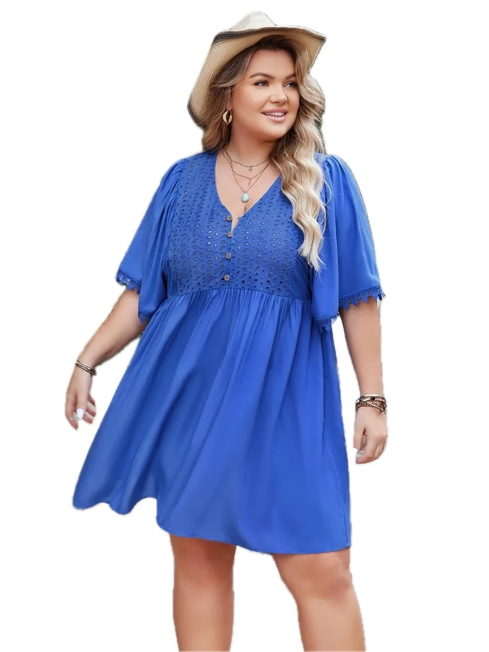Women's Plus Size Openwork Button Up V-Neck Short Sleeve Dress with 100% Viscose Fabric for Comfort and Style Now