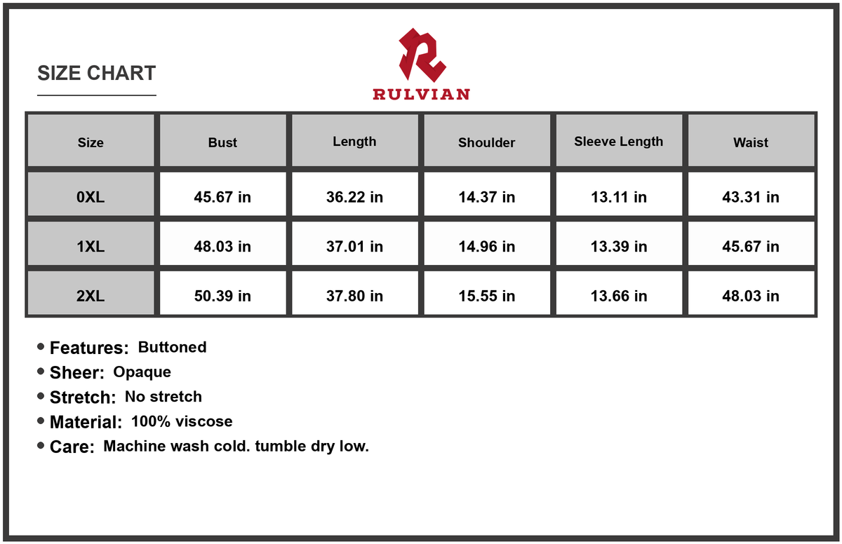 2XL:Length 37.80 in, Shoulder 15.55 in, Bust 50.39 in, Waist 48.03 in, Sleeve Length 13.66 in