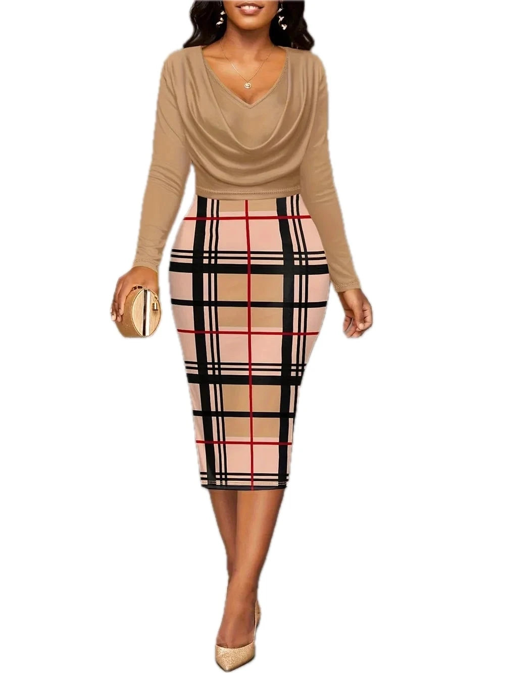 Women's Plus Size Plaid Long Sleeve Mini Dress with Sheer Overlay fabric 95% polyester 5% spandex for everyday wear