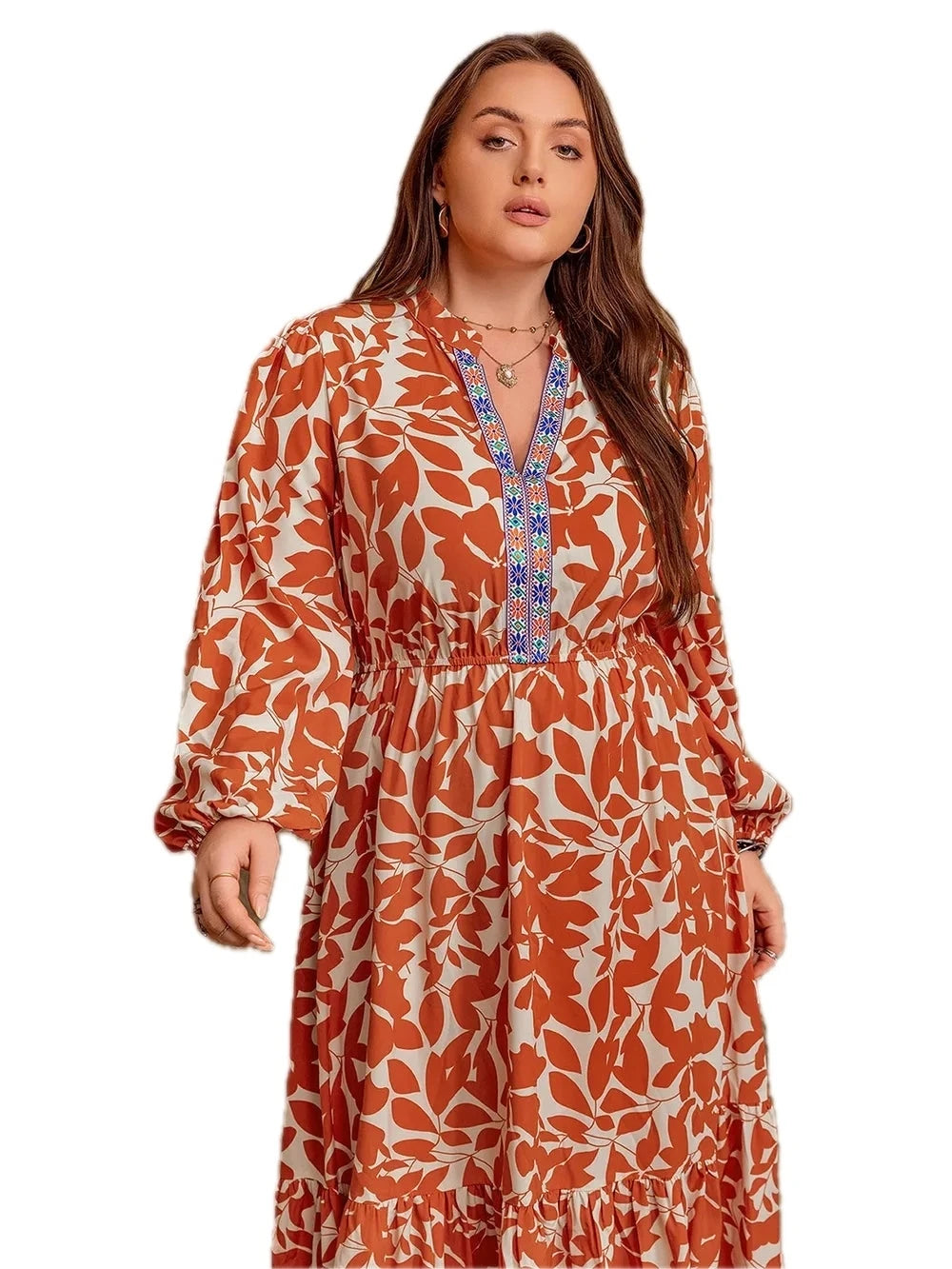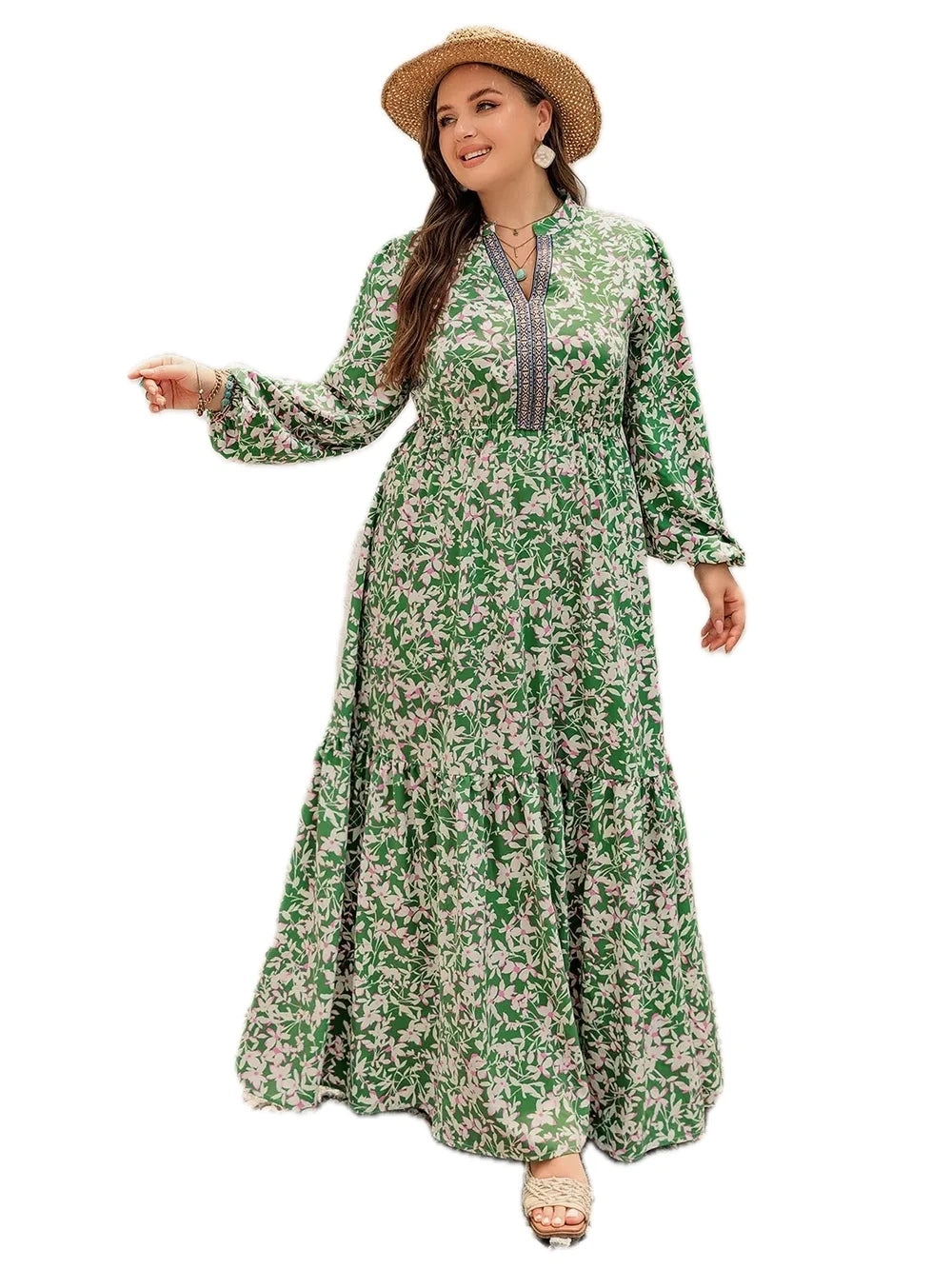 Women's Plus Size Printed Notched Long Sleeve Maxi Dress Ninety Five Percent Polyester And Five Percent Elastane