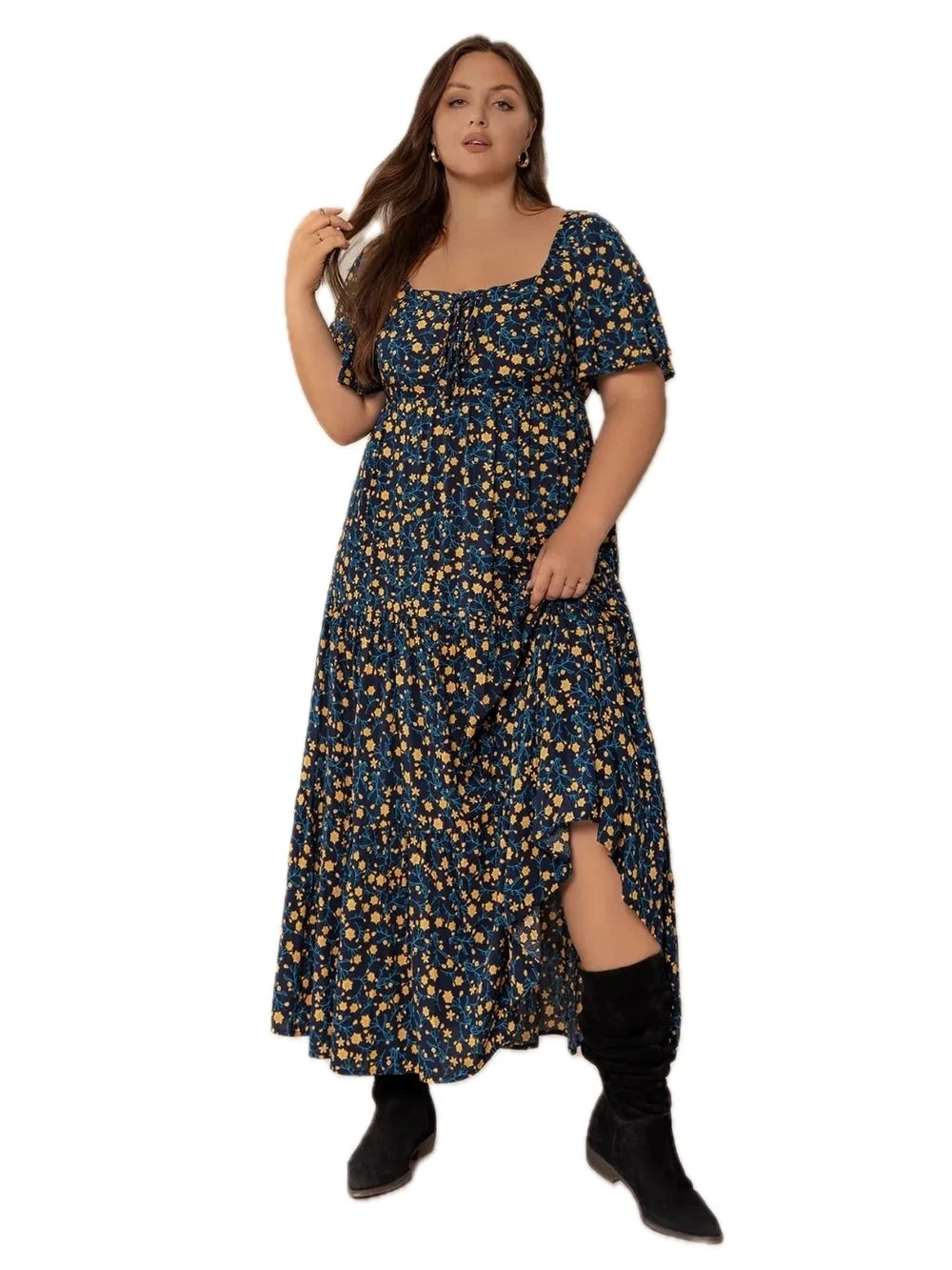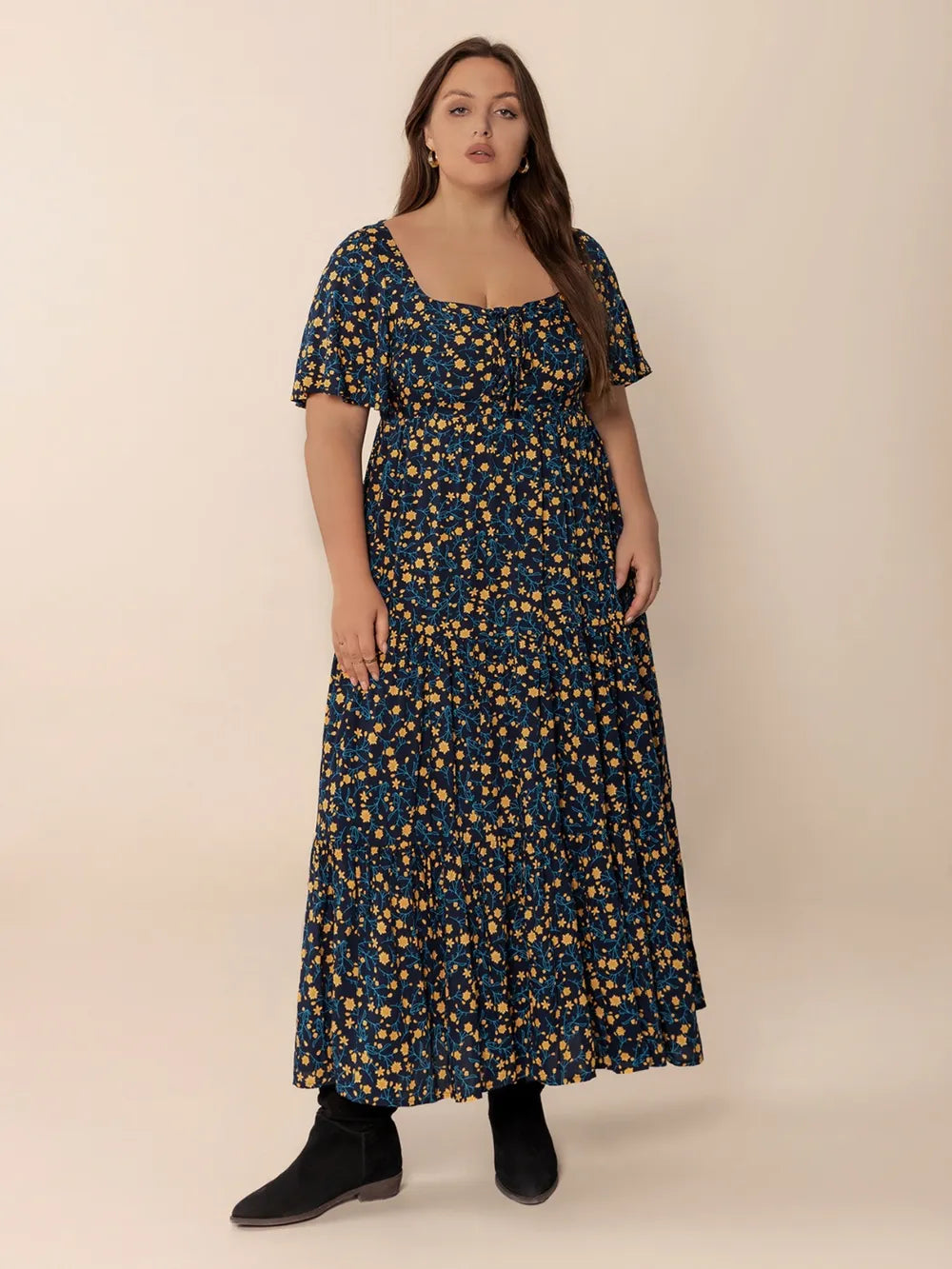 Women's Plus Size Printed Short Sleeve Slit Tiered Maxi Dress 100% viscose Lightweight Flowy Comfort Everyday All Day