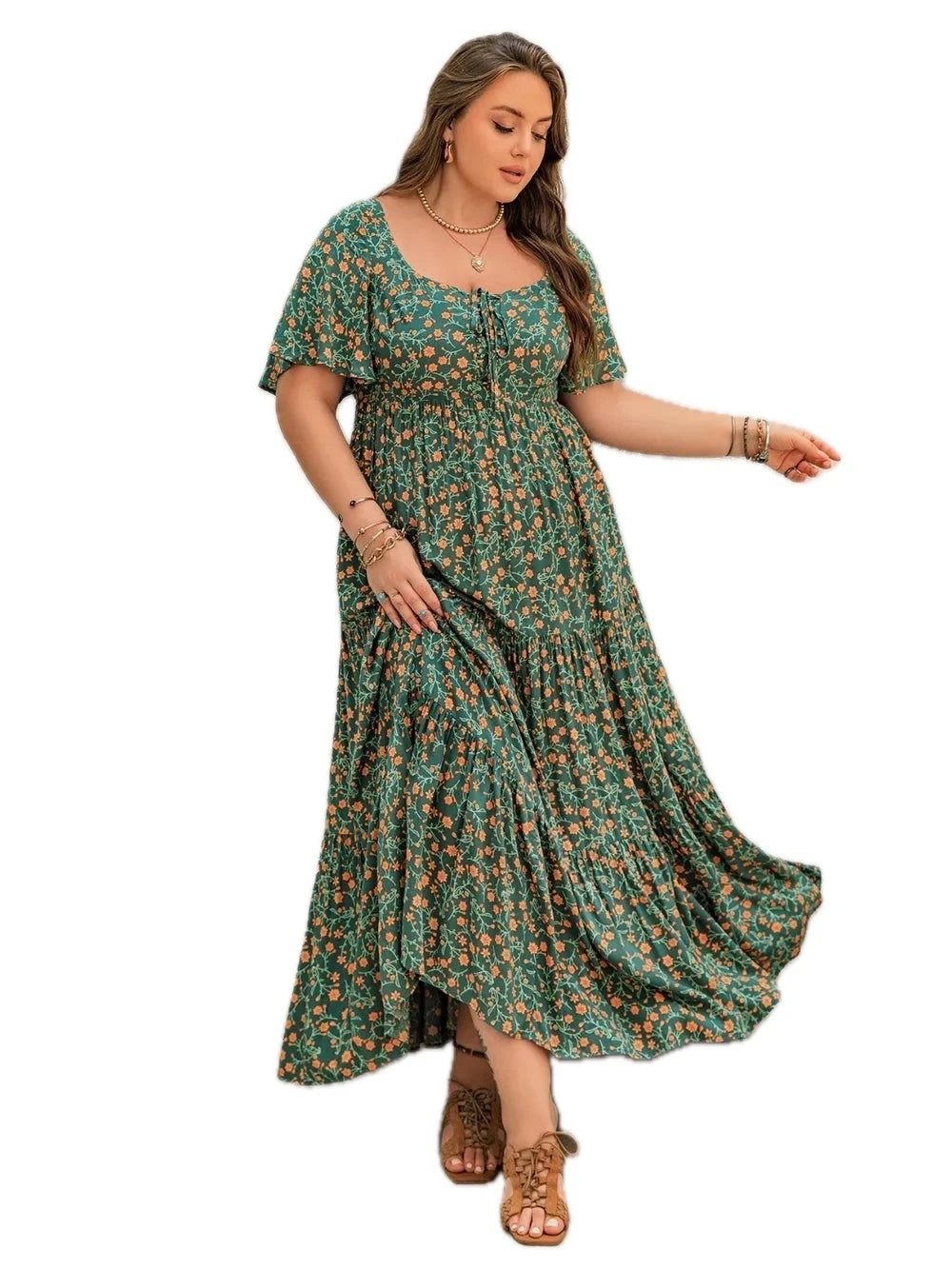 Women's Plus Size Printed Short Sleeve Tiered Maxi Dress with Tie Ruched Details 100% viscose fabric soft drape design