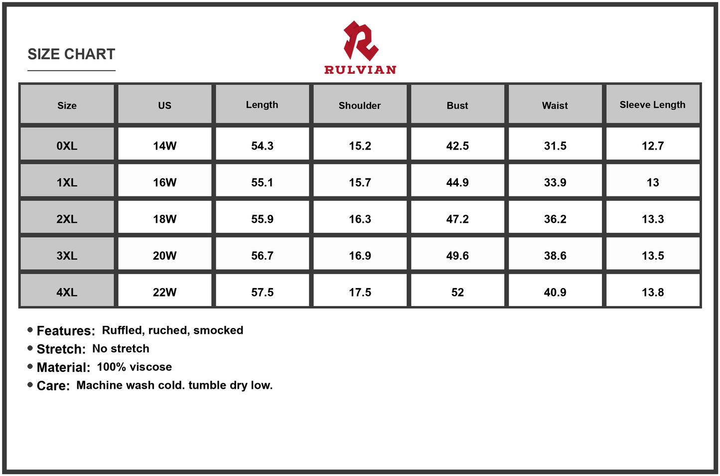 Size US Length Shoulder Bust Waist Sleeve Length