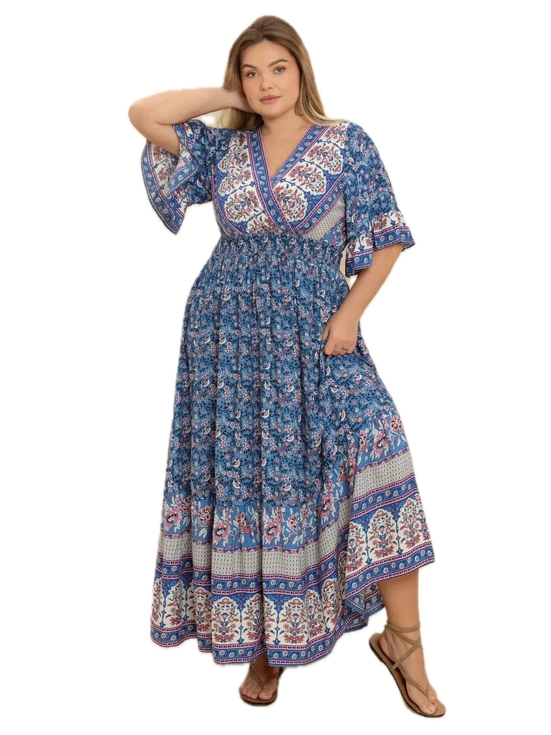 Women's Plus Size Printed Surplice Half Sleeve Dress with Ruffle Ruched Details in 100% viscose fabric for Fit