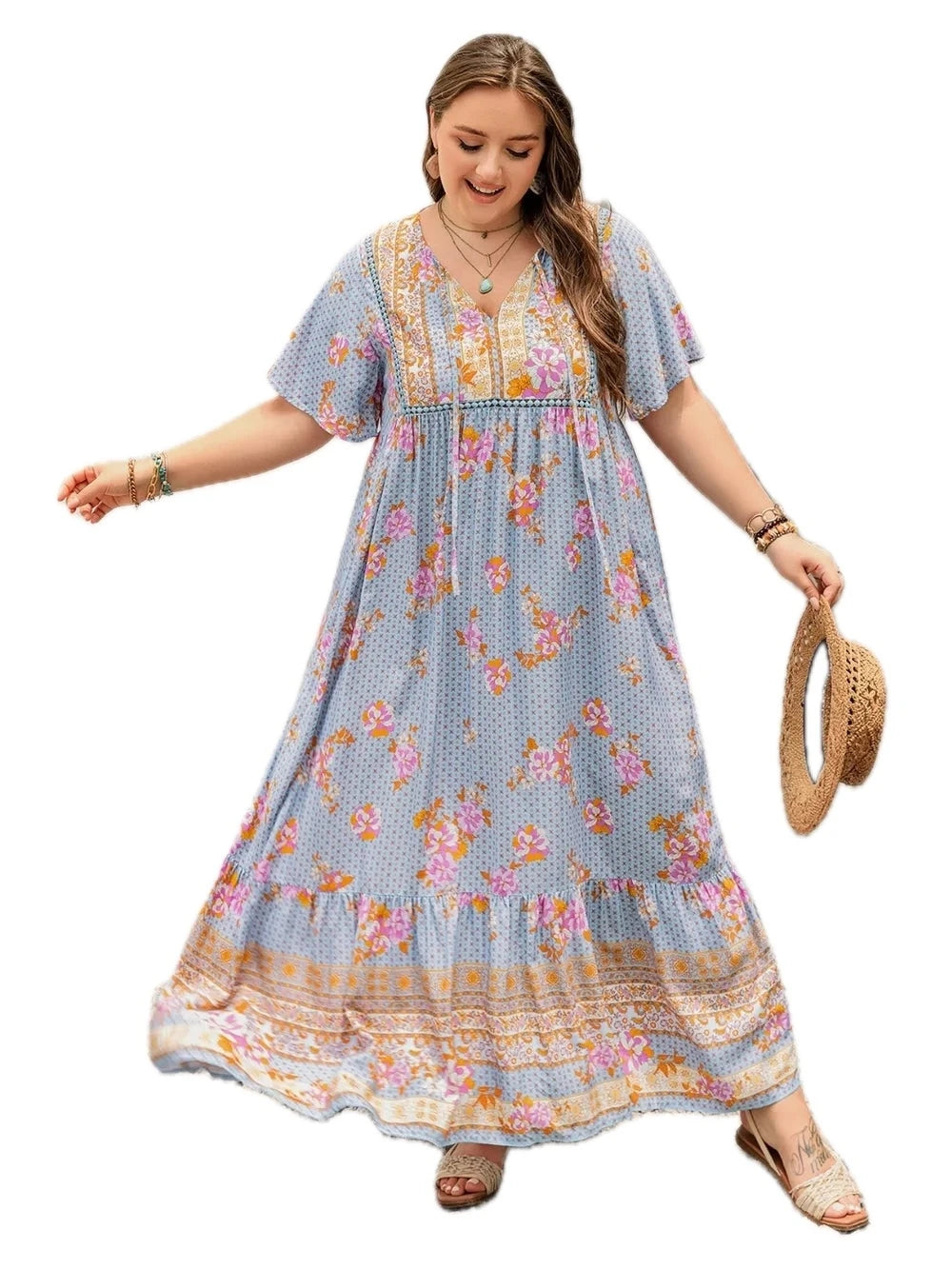 Women's Plus Size Printed Tie Neck Flutter Sleeve Maxi Dress 100% Viscose Elegant Comfort For All Day Wear Everyday
