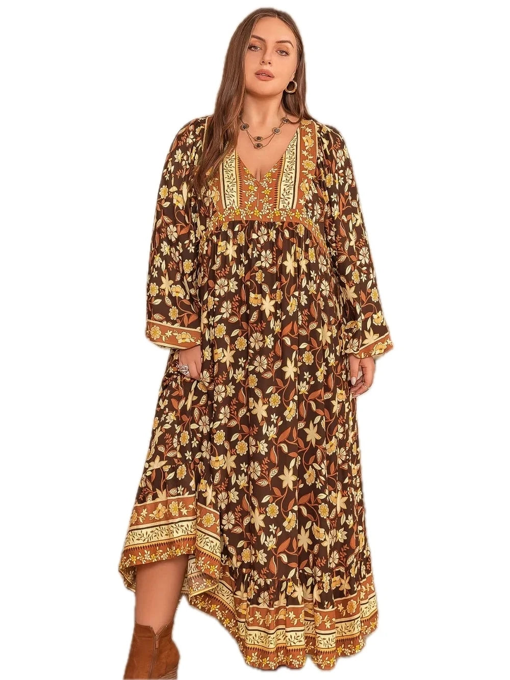 Women's Plus Size Printed V Neck Balloon Sleeve Dress 100% Viscose for a soft drape and comfortable all day wear