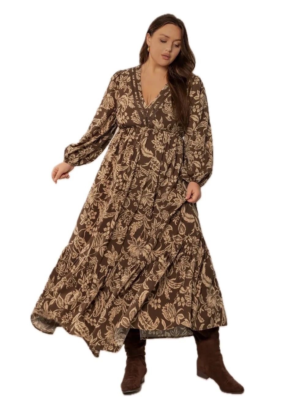 Women's Plus Size Printed V Neck Balloon Sleeve Maxi Dress with Ruched Sheer Overlay 100% Polyester Fabric for Everyday