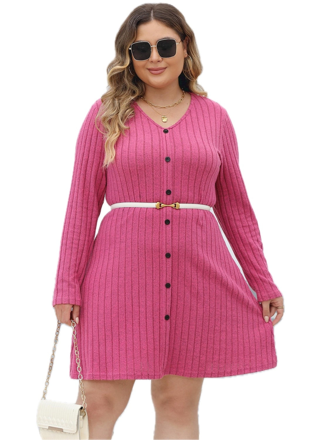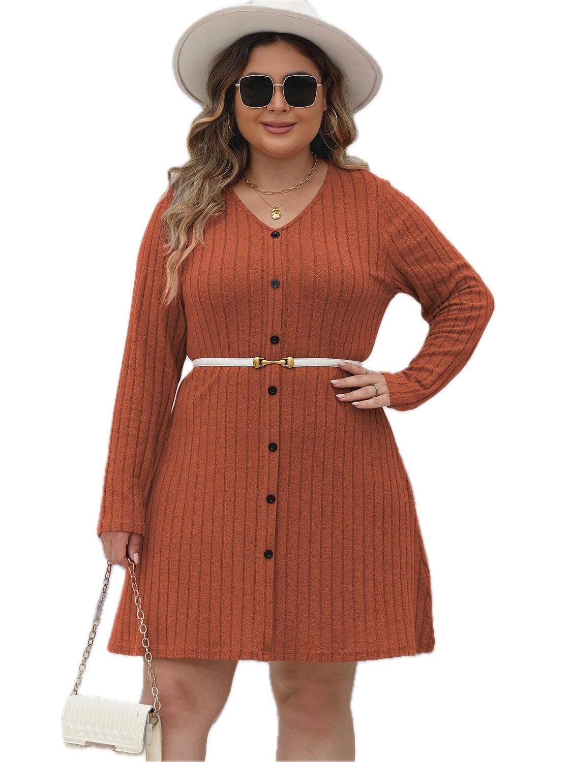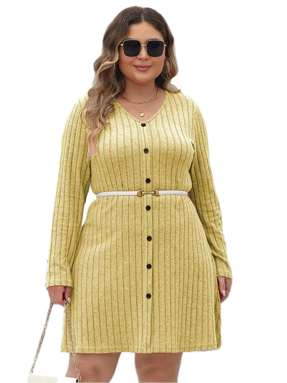 Women's Plus Size Ribbed Buttoned V Neck Long Sleeve Dress with Stretch 95% Polyester 5% Elastane For Work Or Casual