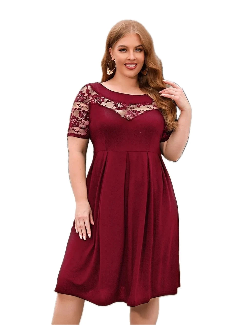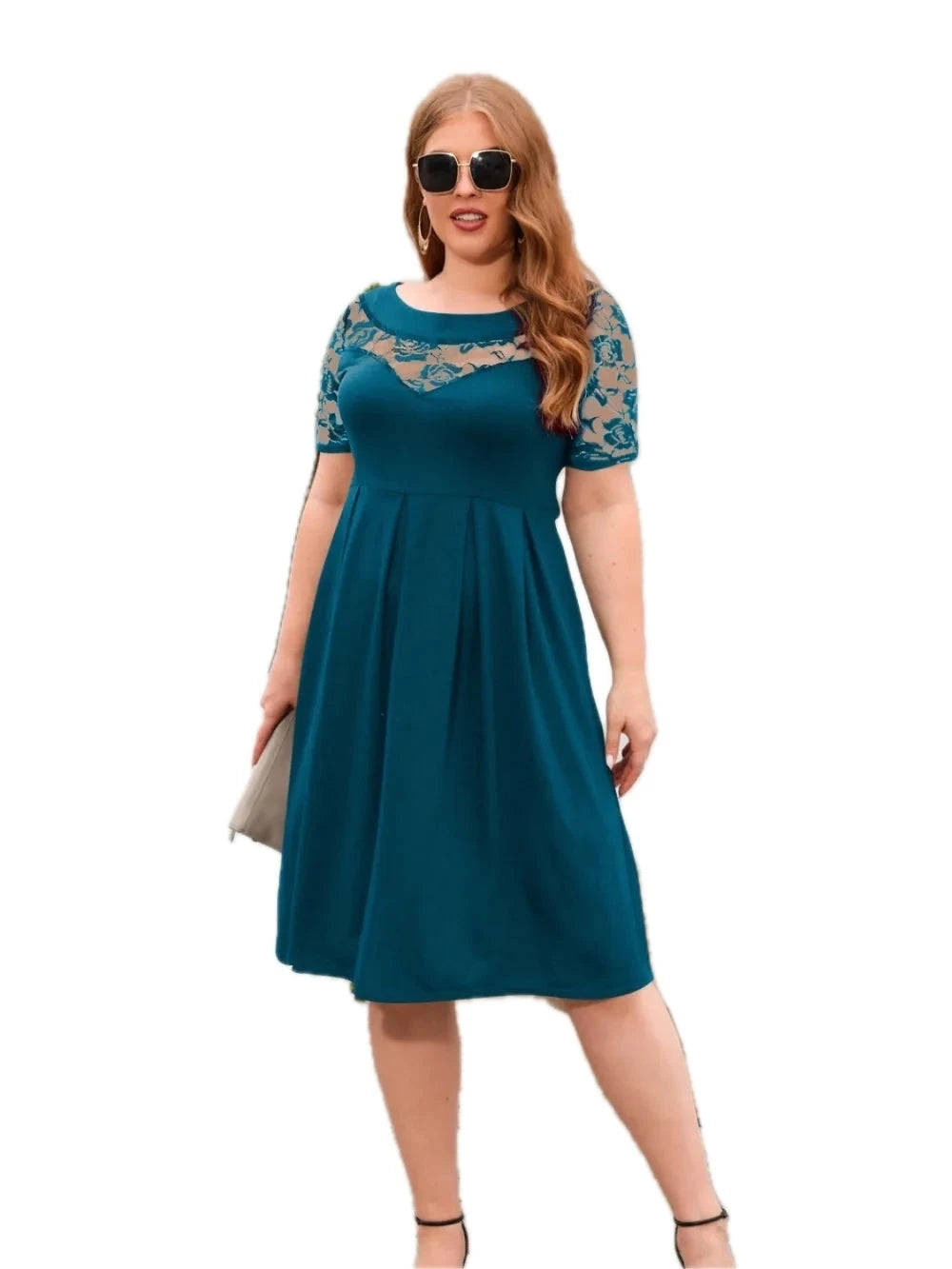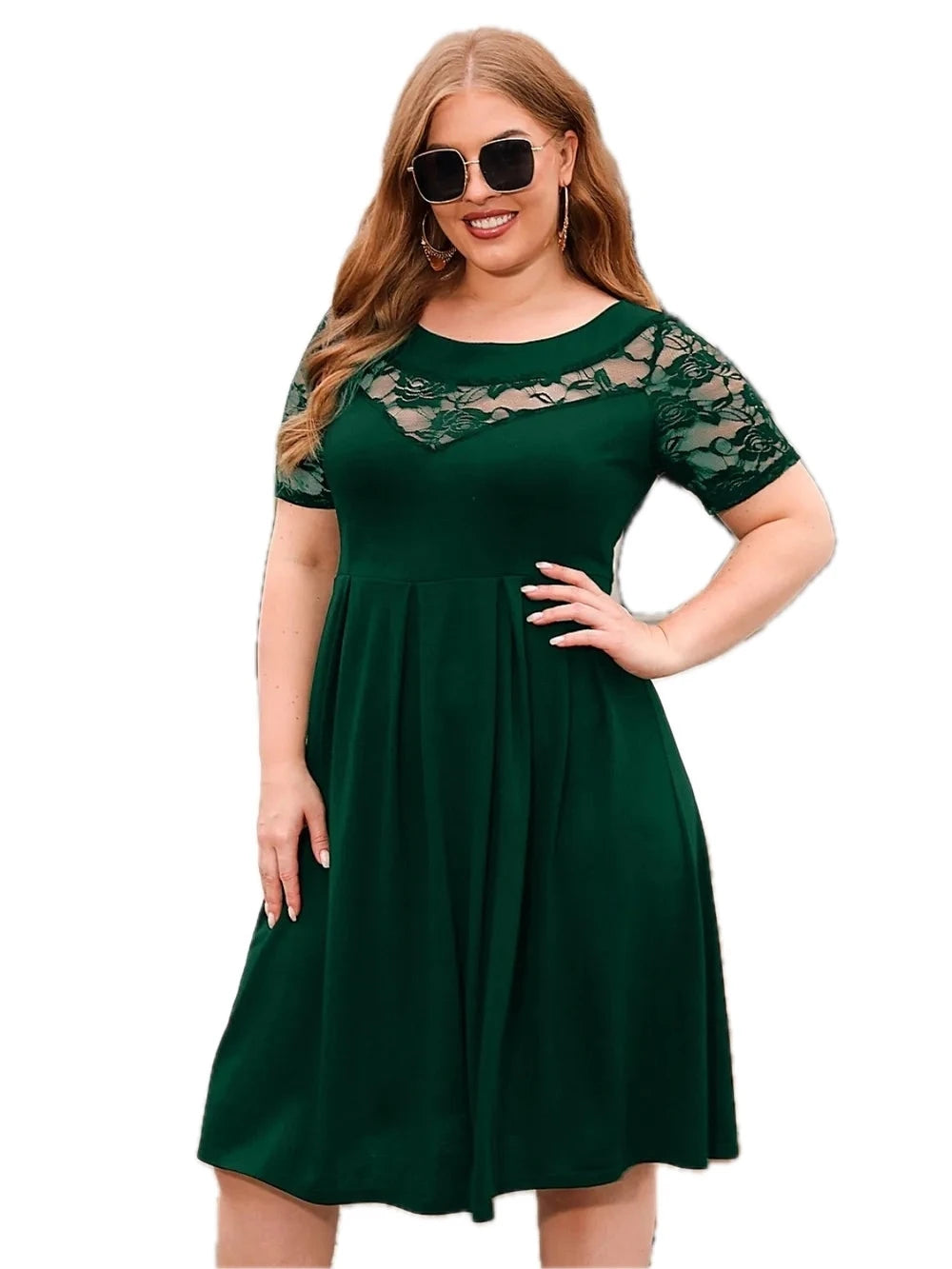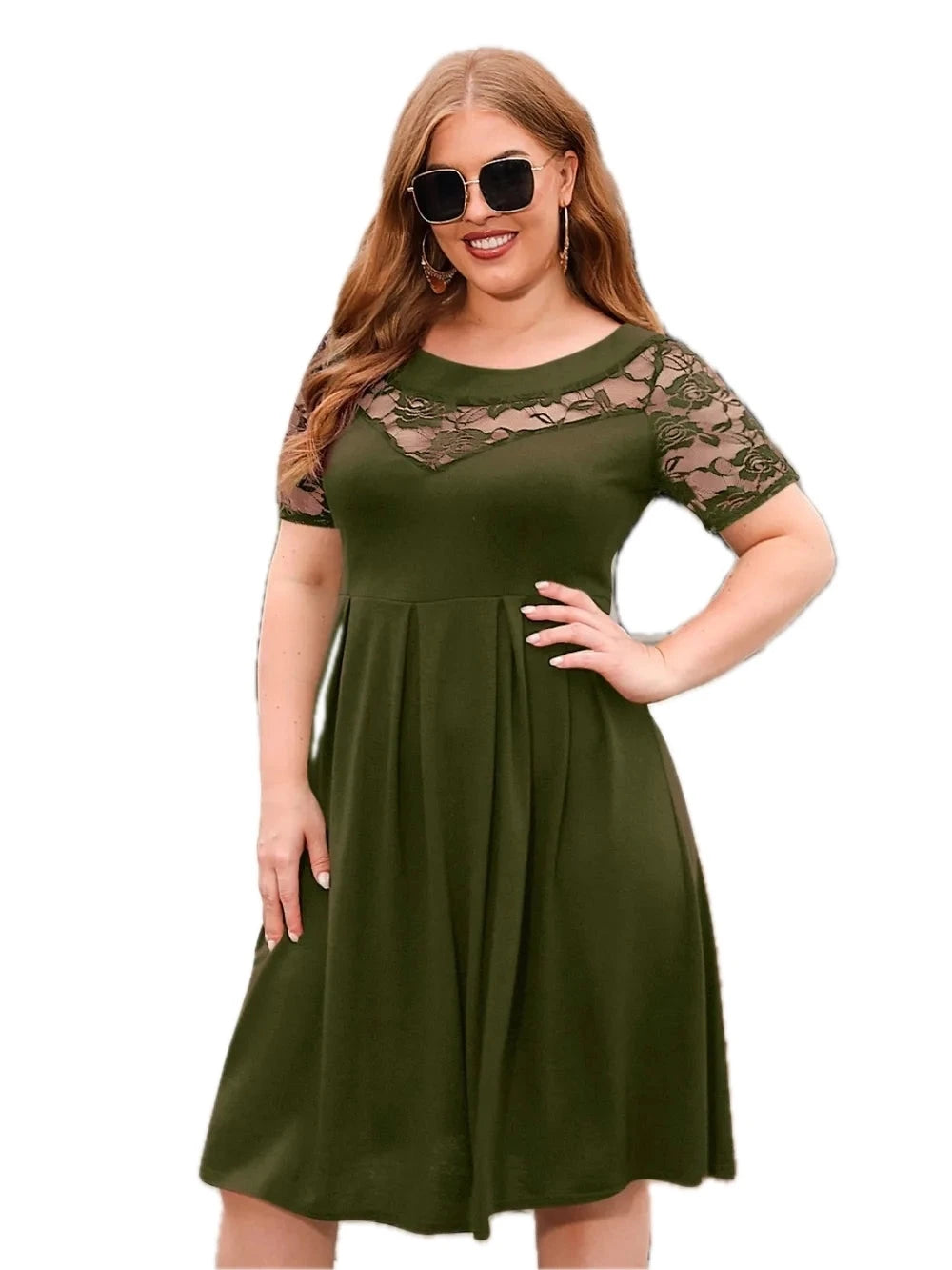 Women's Plus Size Ruched Round Neck Short Sleeve Dress Lace Detail Semi Sheer Fabric soft 95% cotton 5% polyester