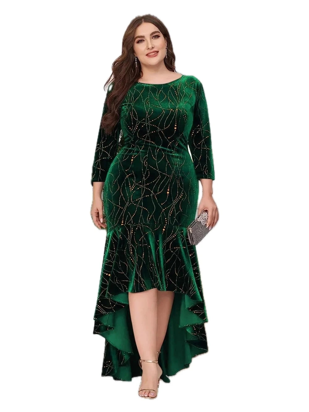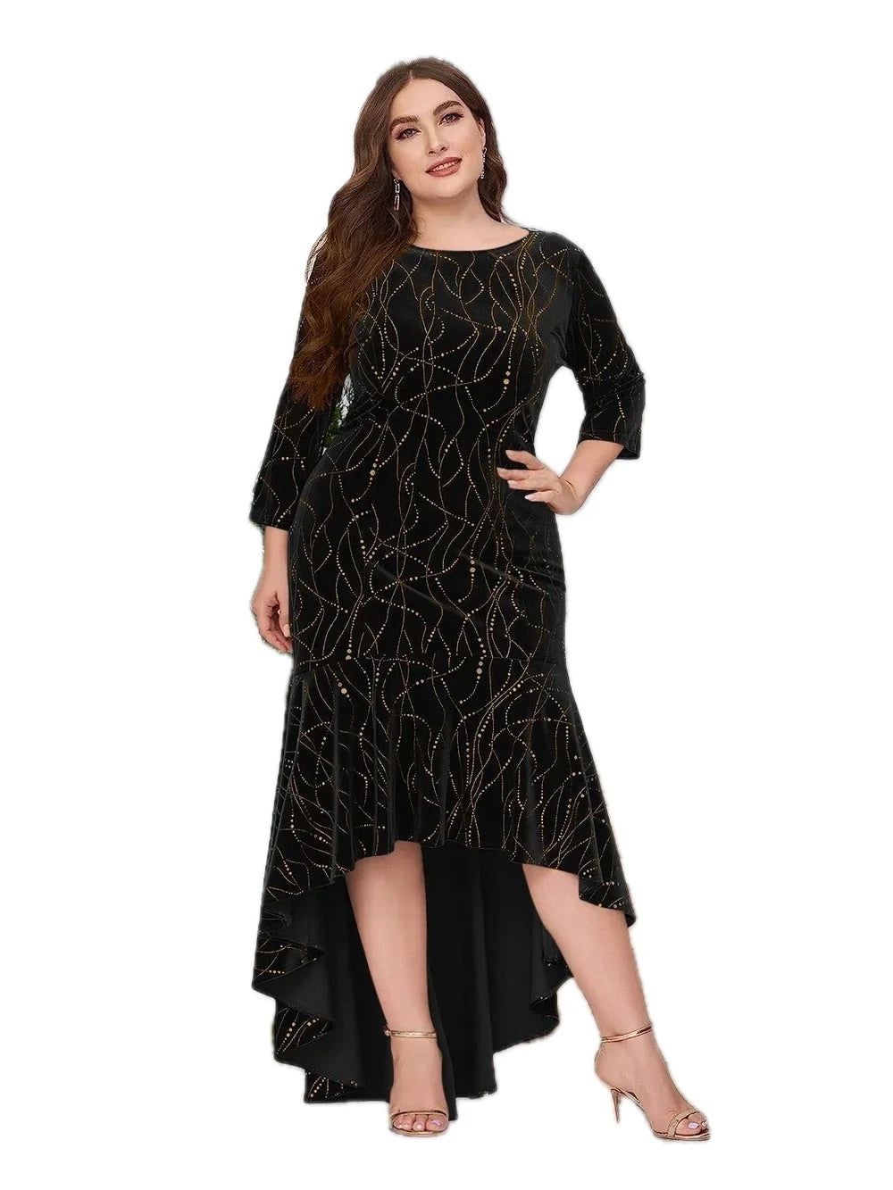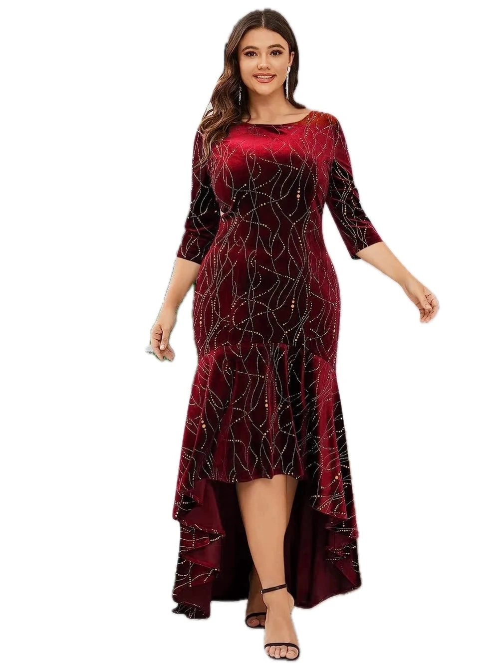 Women's Plus Size Ruffle Hem High Low Dress with Sheer Overlay and Stretch Bodice 95% polyester 5% spandex style