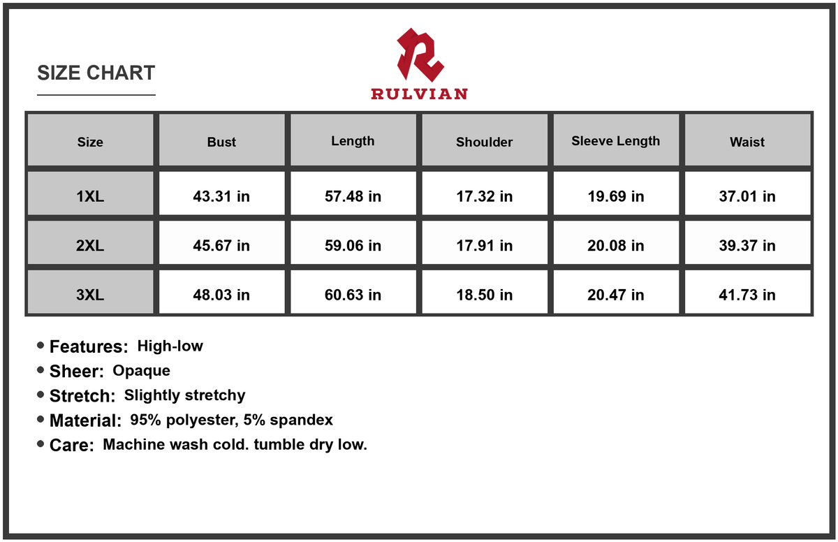 1XL:Length 57.48 in, Bust 43.31 in, Sleeve Length 19.69 in, Waist 37.01 in, Upperarm 46.46 in, Shoulder 17.32 in