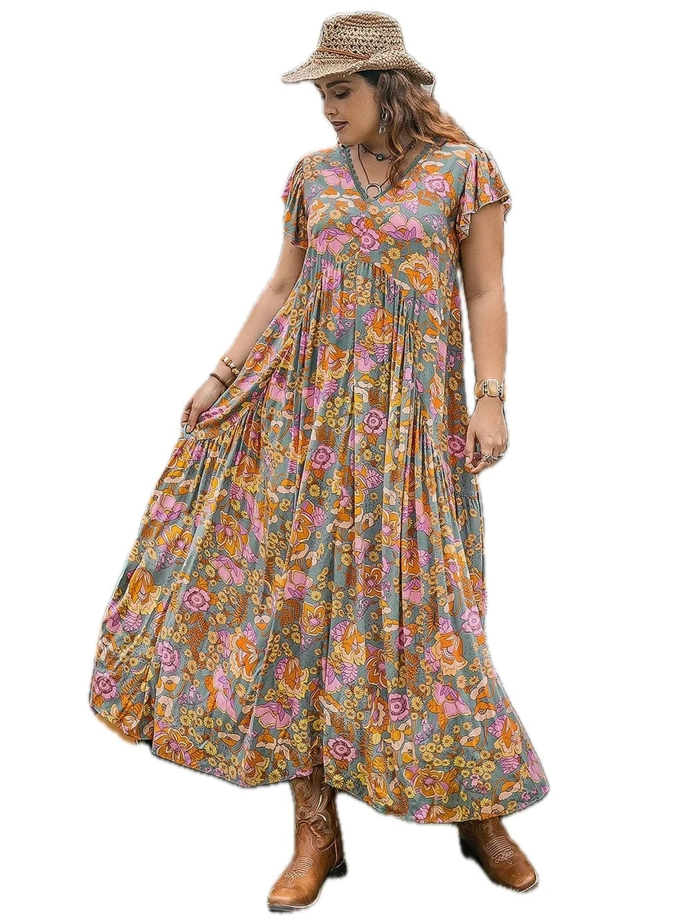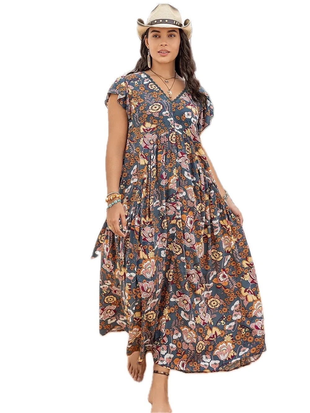 Women's Plus Size Ruffled Printed Cap Sleeve Dress 100% viscose Fabric for comfortable fit and drape for everyday wear