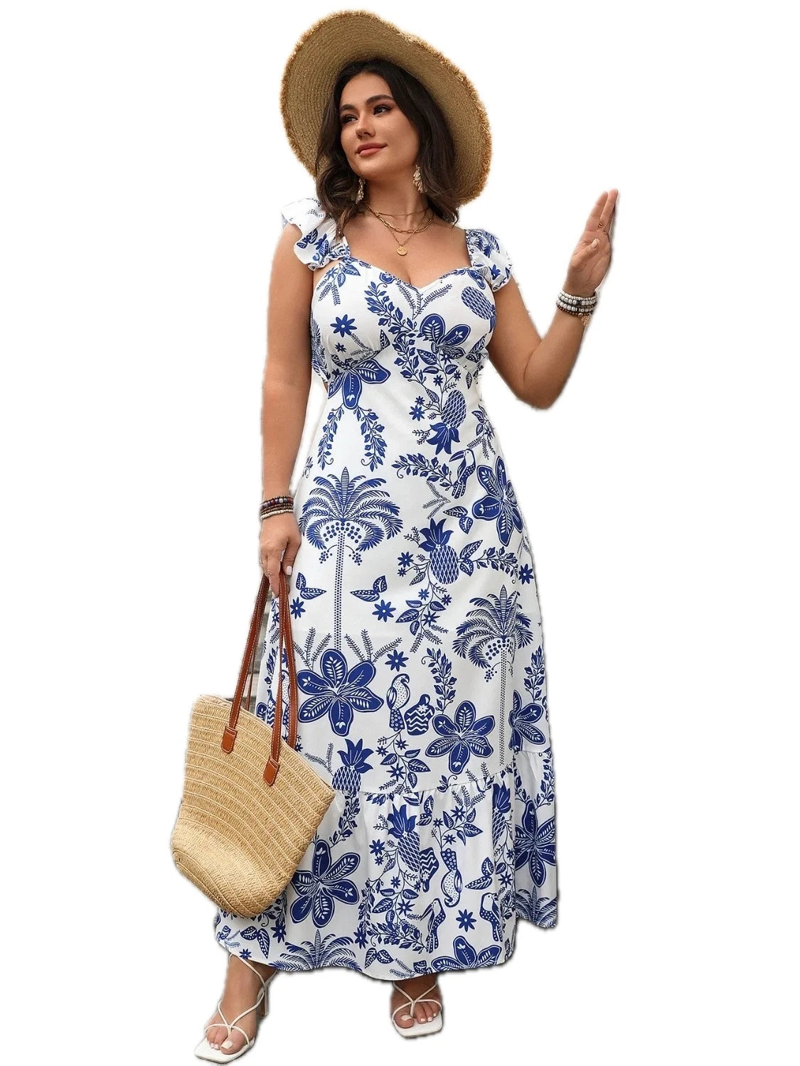 Women's Plus Size Ruffled Printed Sweetheart Neck Maxi Cami Dress 100% Polyester Elegant Silhouette Wear Casual