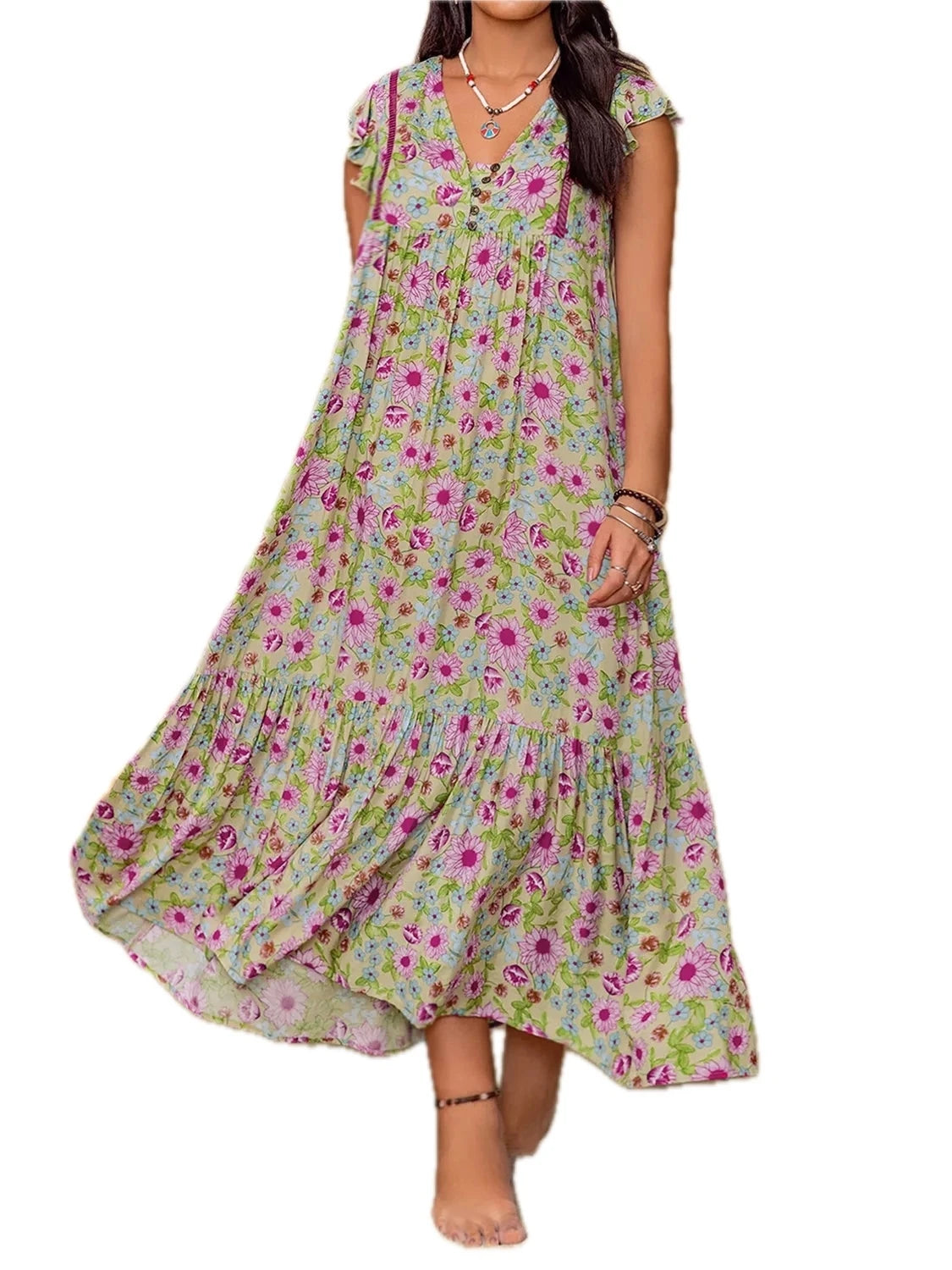 Women's Plus Size Ruffled Printed V Neck Midi Dress with Buttoned Ruched Details 100% viscose fabric Everyday Wear