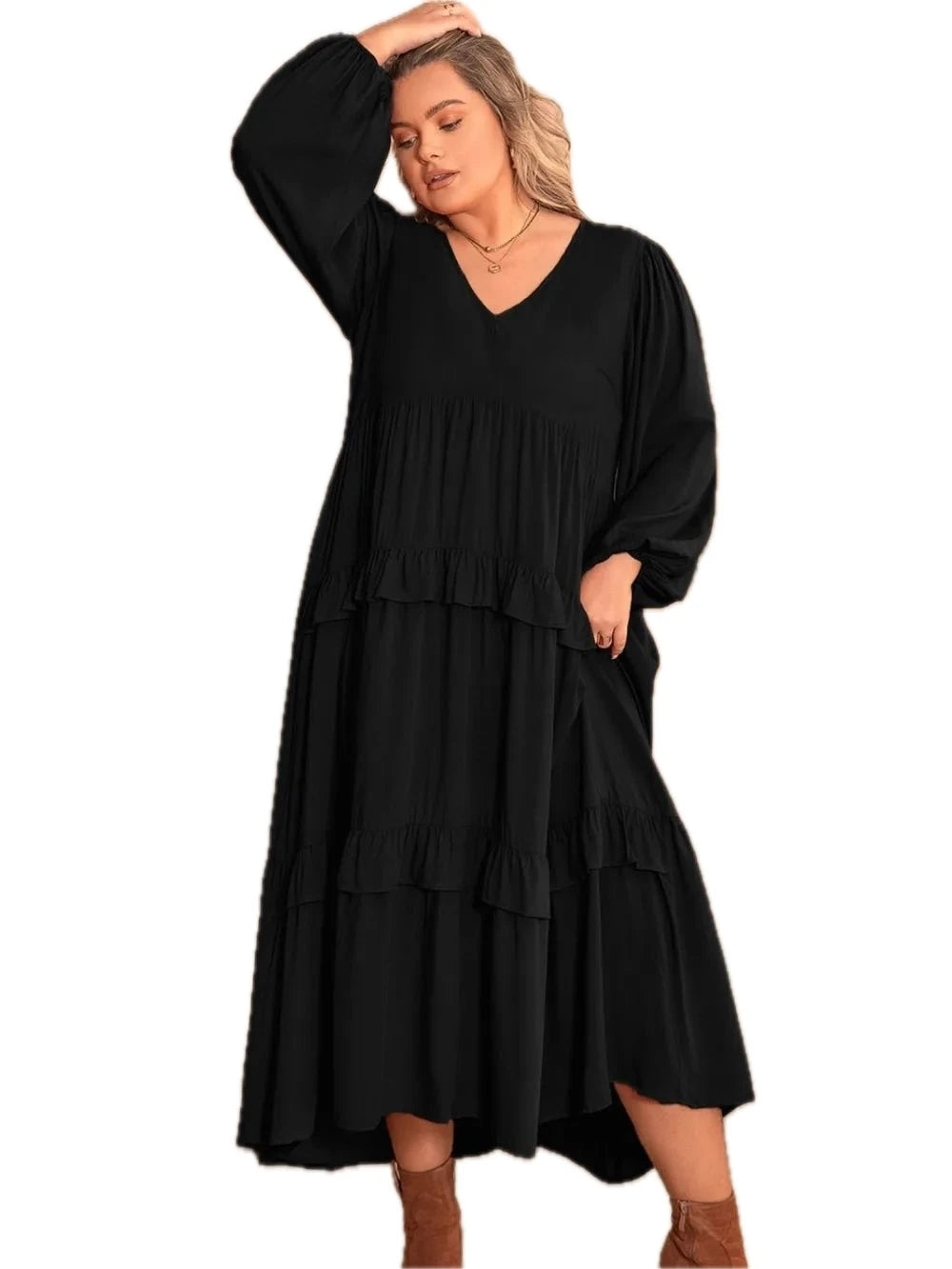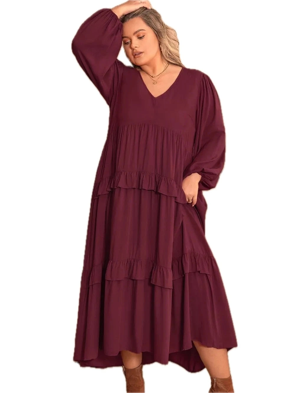 Women's Plus Size Ruffled V Neck Long Sleeve Dress 100% viscose fabric Comfortable and Elegant for Everyday Wear