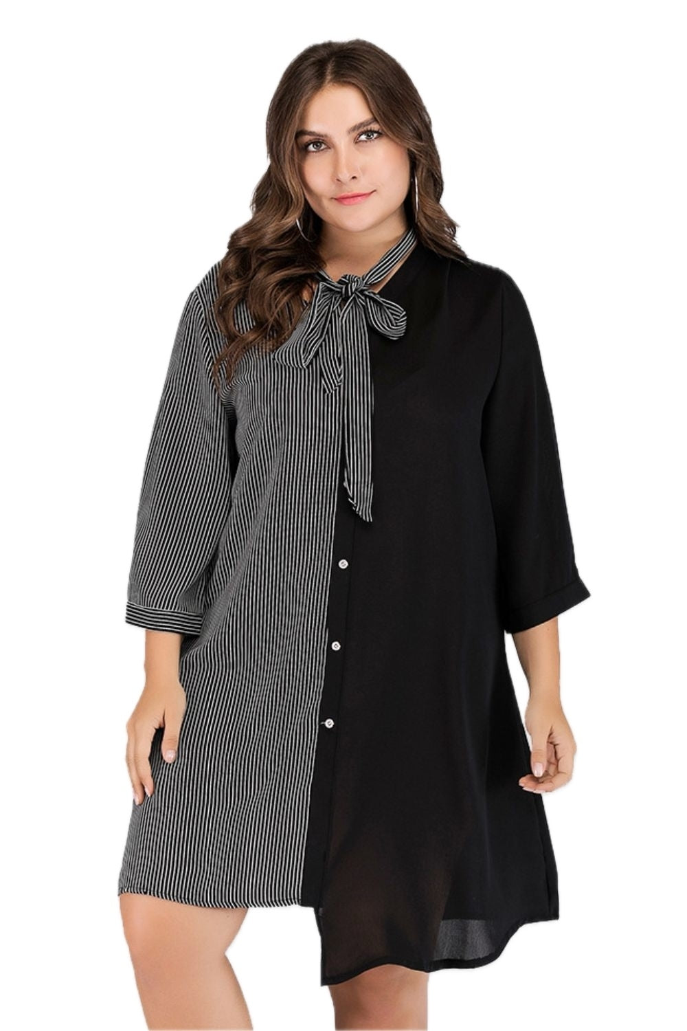 Women's Plus Size Striped Color Block Tie Neck Dress Casual Sixty five percent polyester thirty five percent cotton