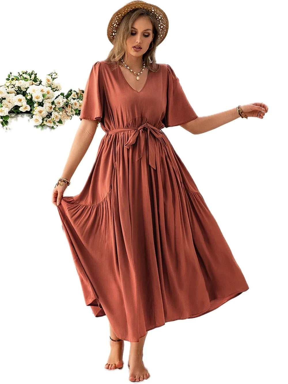 Women's Plus Size V Neck Flutter Sleeve Midi Dress Viscose % Fabric for Elegant Everyday Comfort and Easy Wear All Day