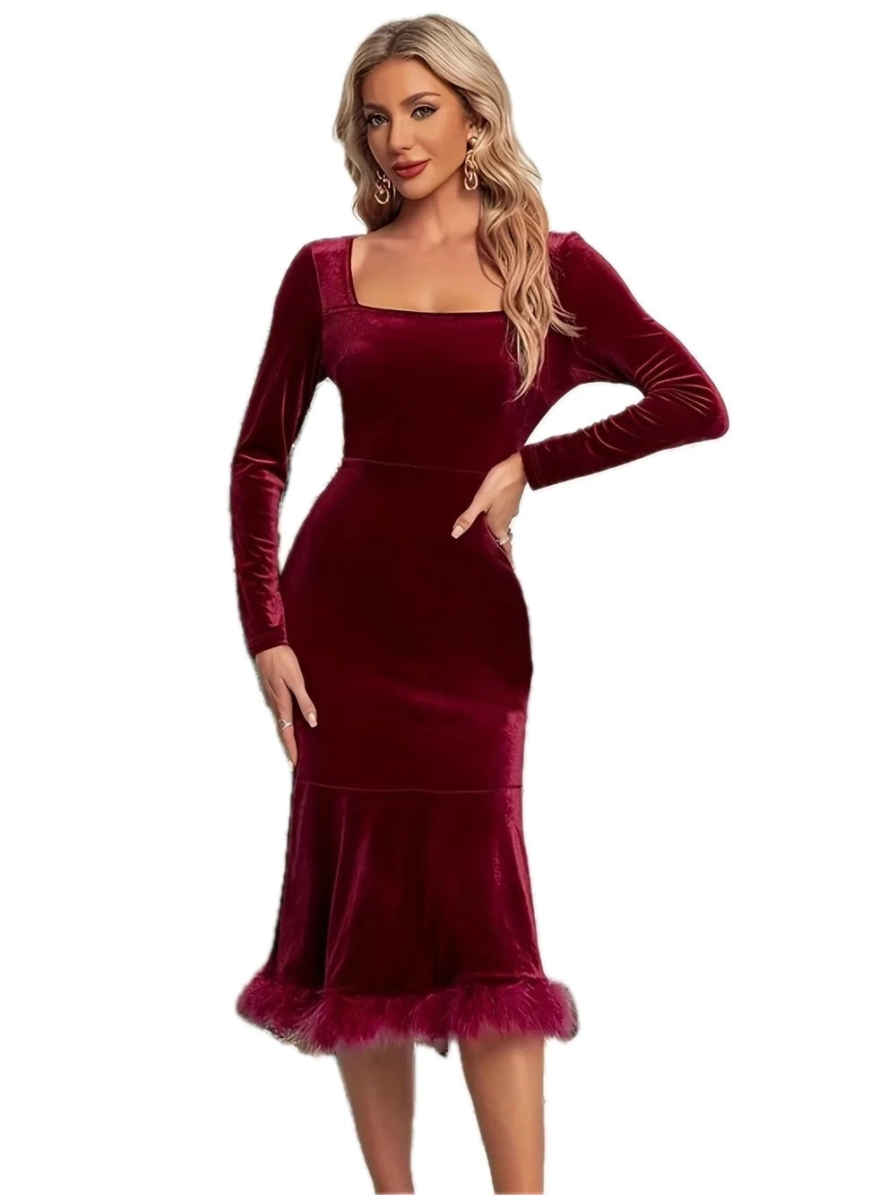 Women's Plush Hem Square Neck Long Sleeve Dress 95% polyester 5% spandex Easy care versatile evening to day wear