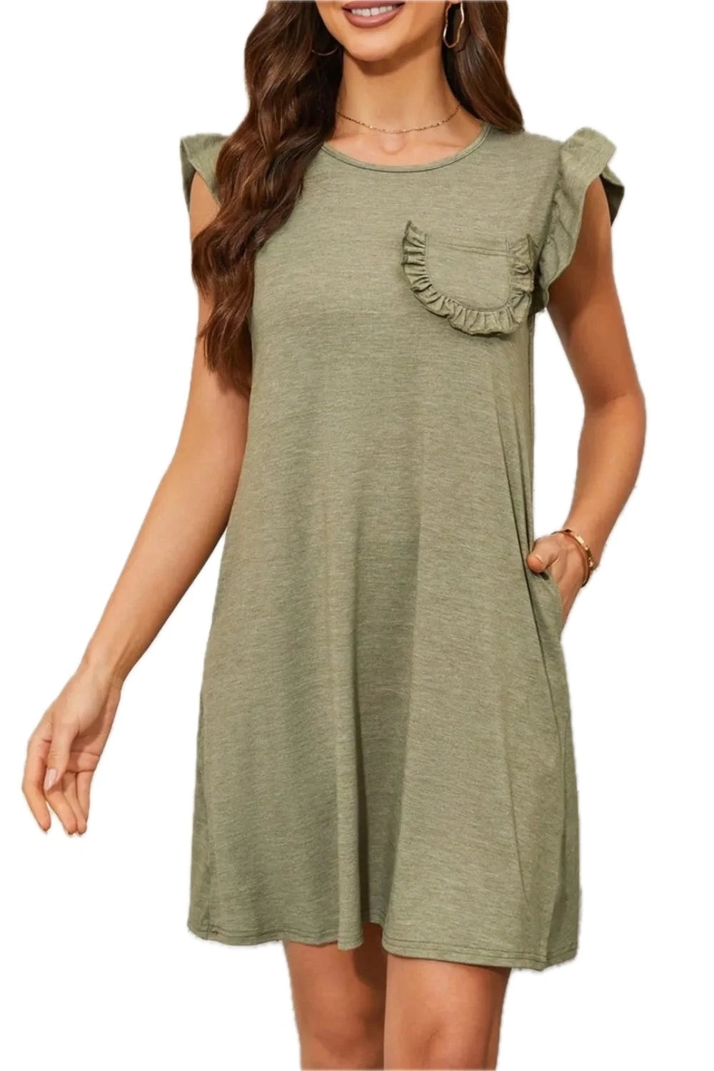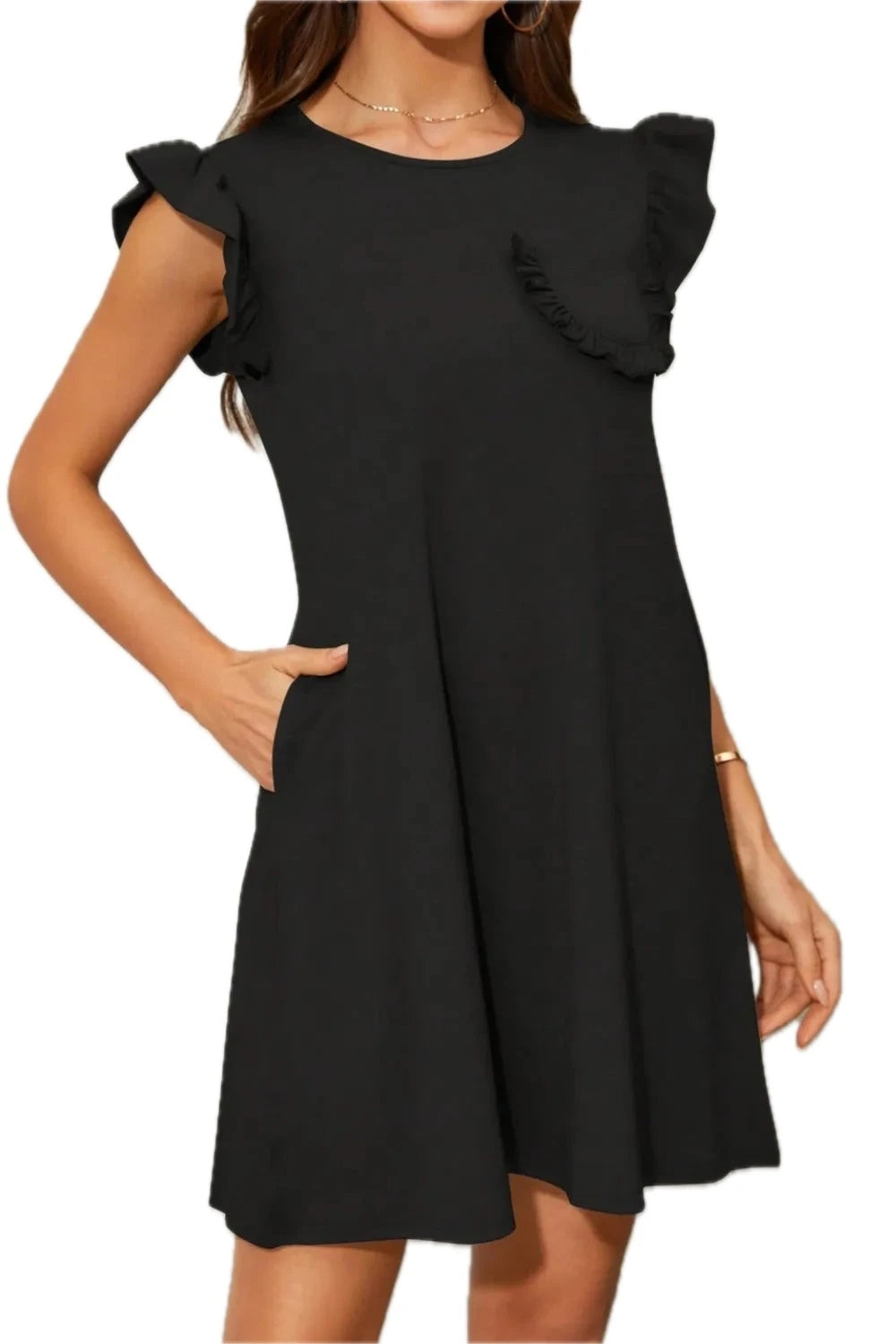 Women's Pocketed Ruffled Cap Sleeve Mini Dress with Sheer Overlay Lightweight 65% Polyester 30% Viscose 5% Elastane