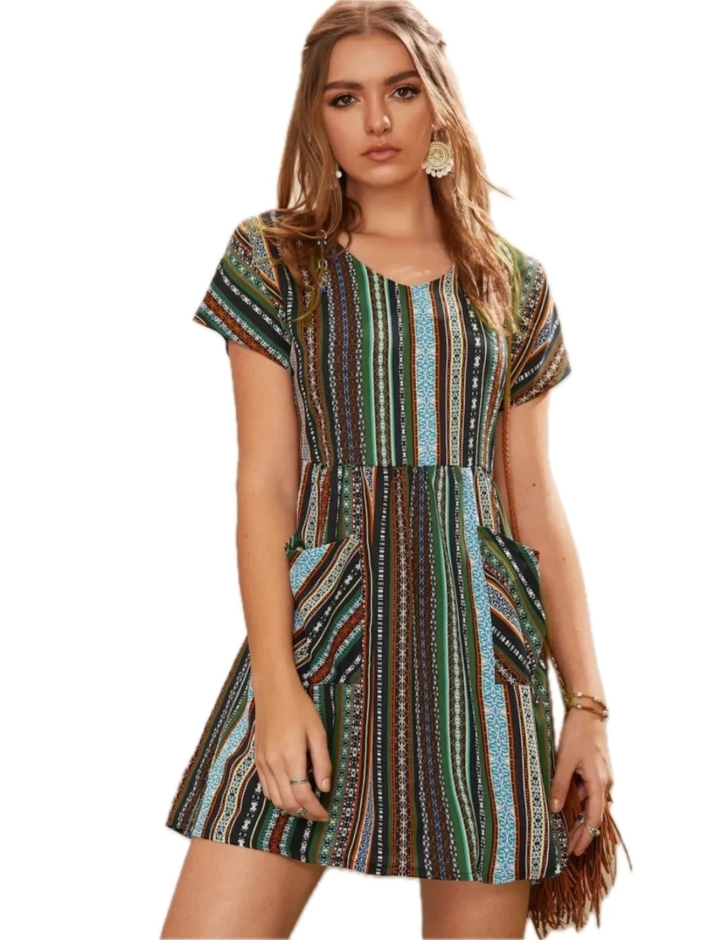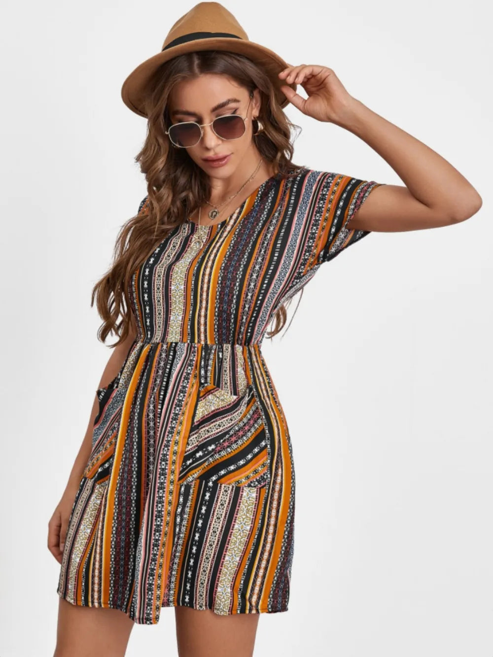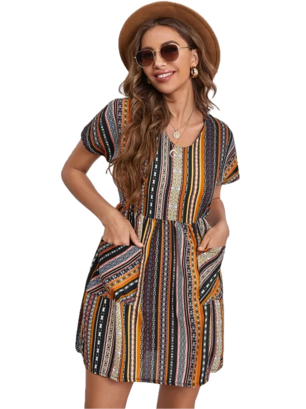 Women's Pocketed Striped Short Sleeve Dress 100% Polyester Easy Care Machine Washable Everyday Wear Travel Ready