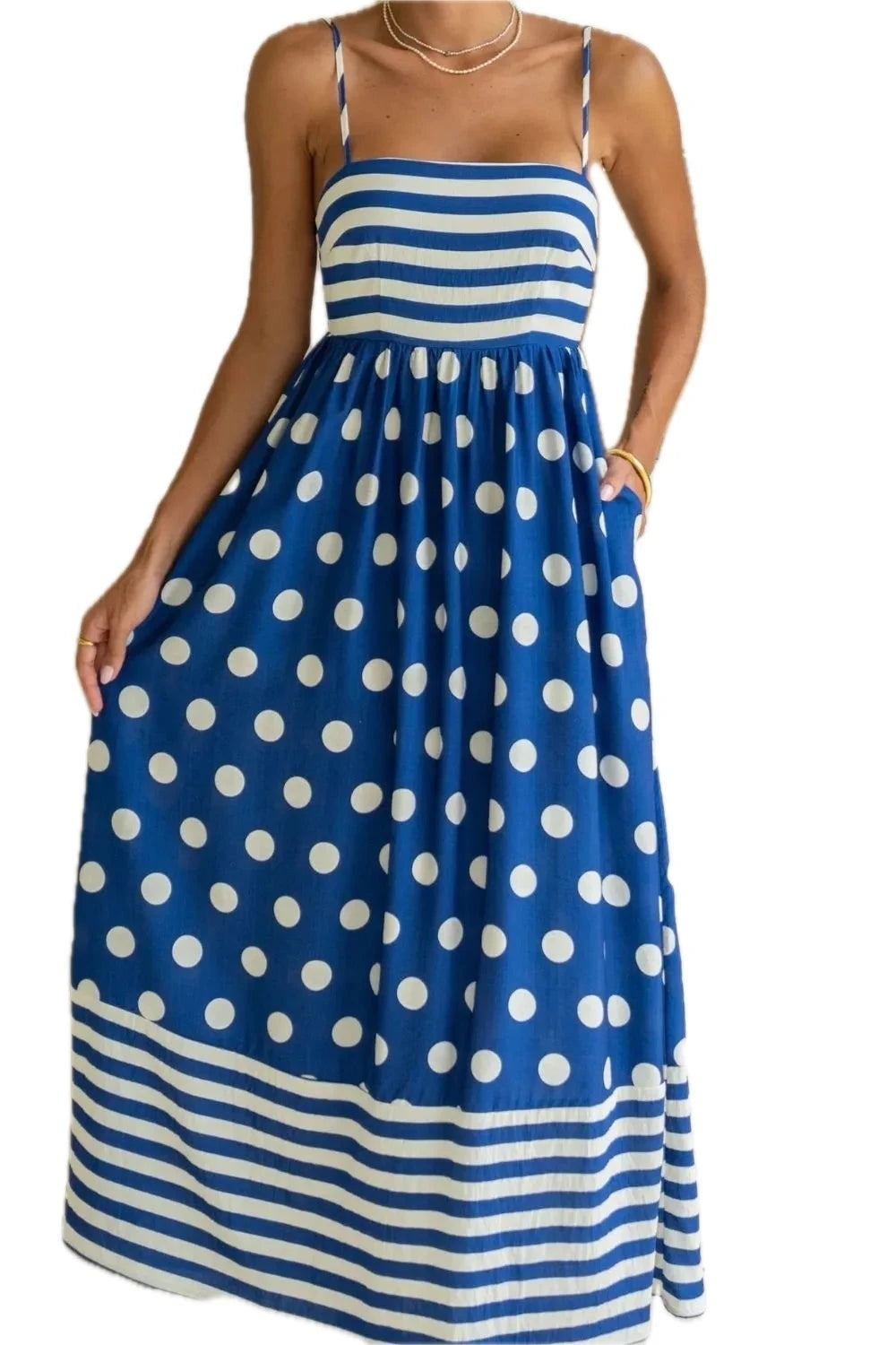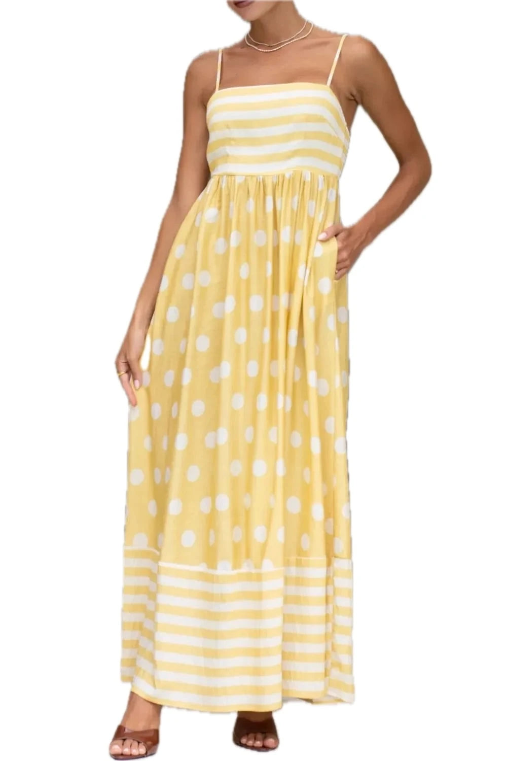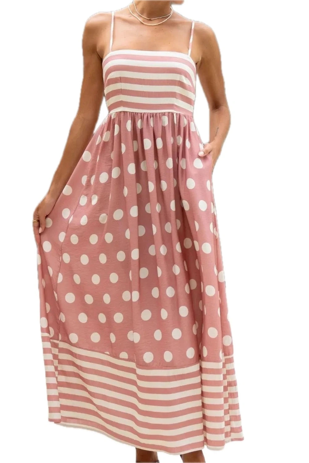Women's Polka Dot Square Neck Cami Dress Pocketed Smocked Bodice Non Stretch Silhouette Everyday 100% Polyester Fabric