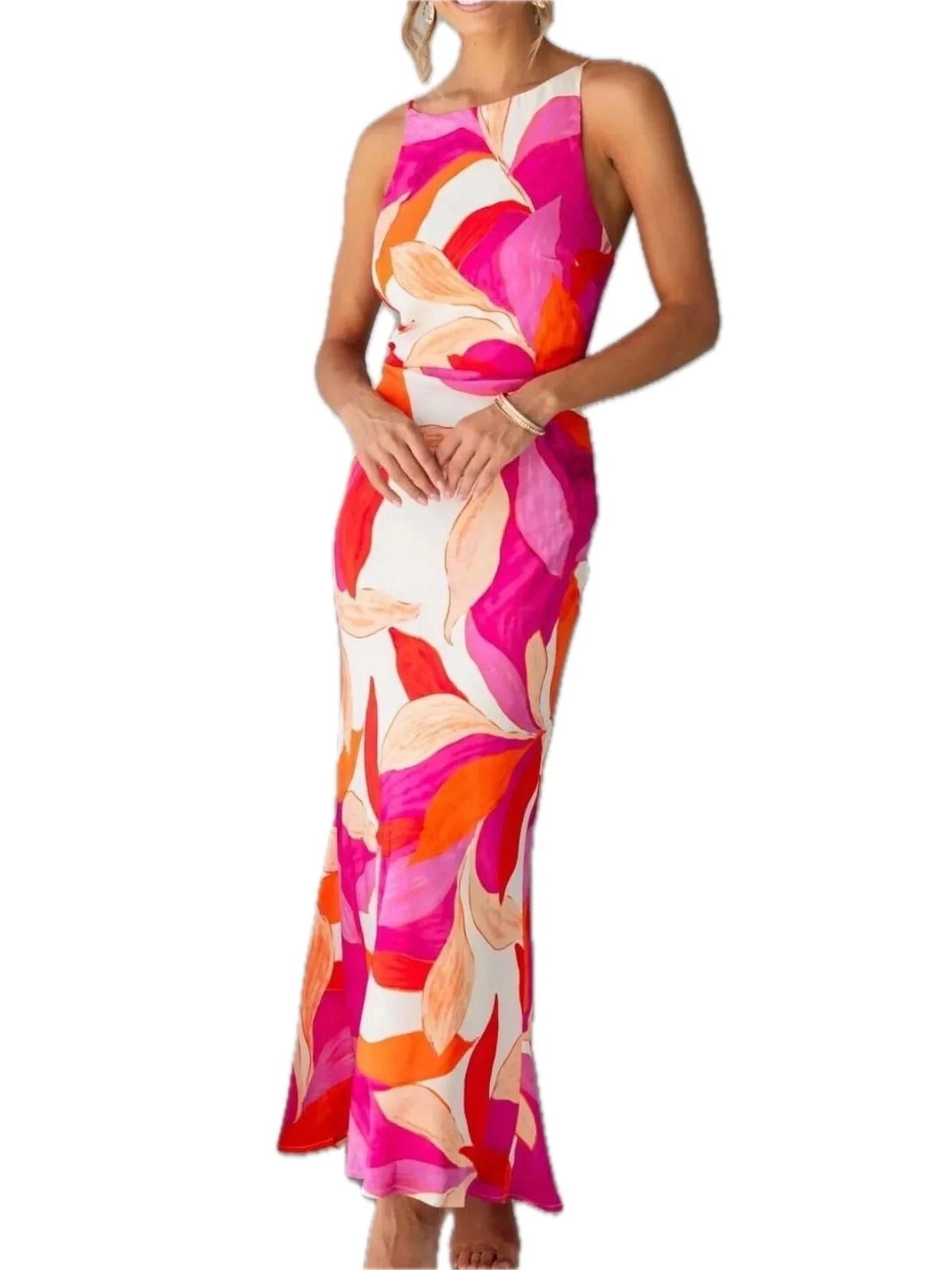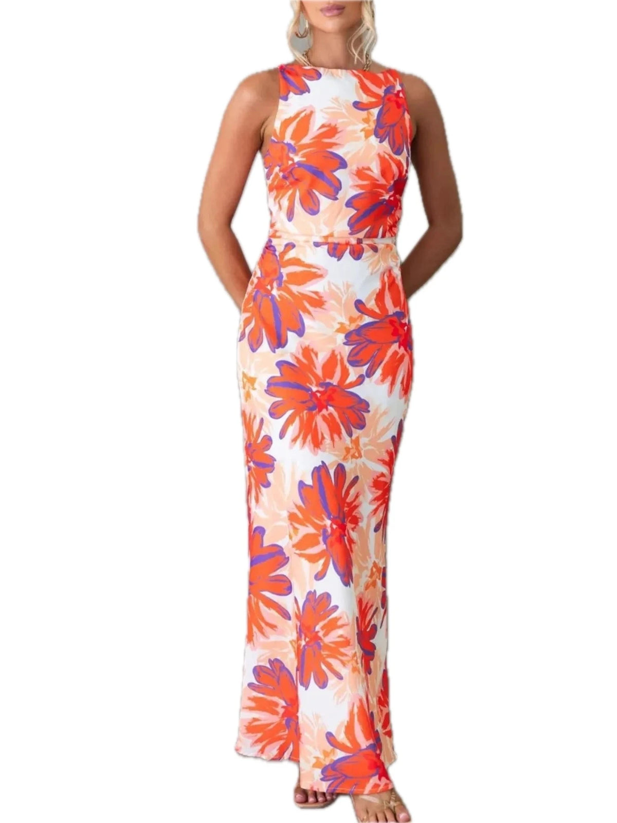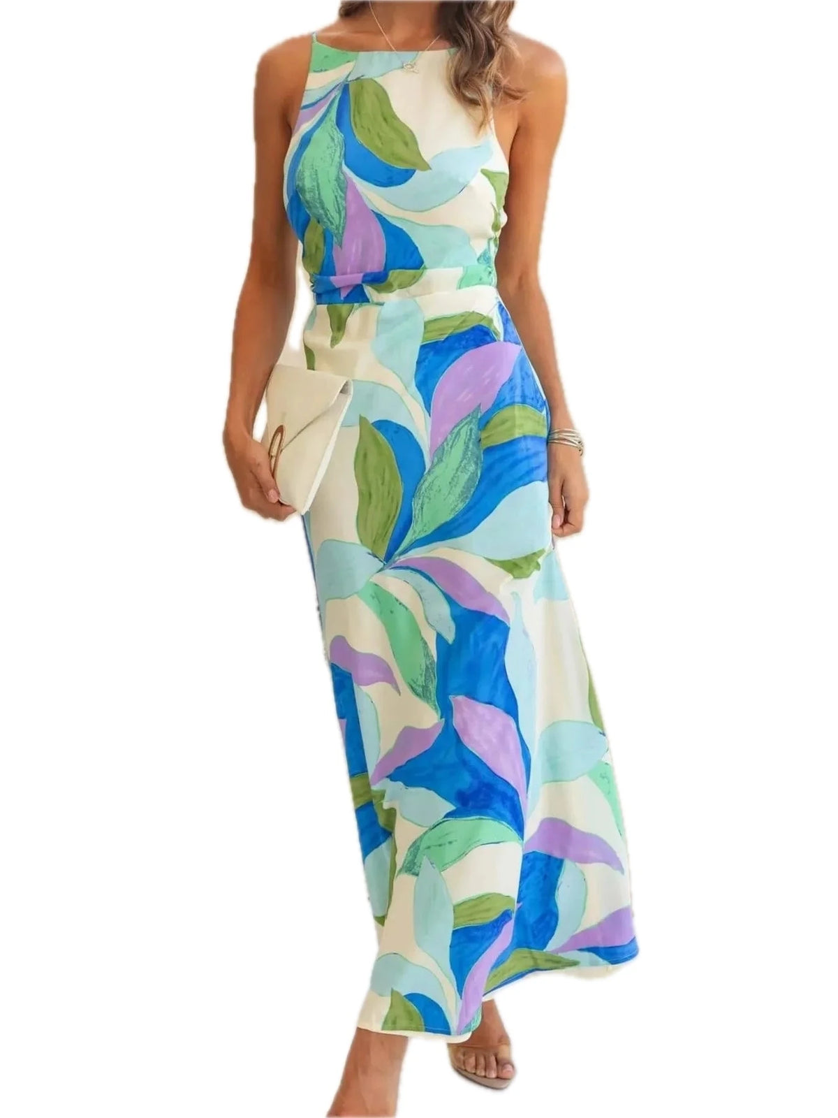 Women's Printed Backless Sleeveless Maxi Dress with Flowing Silhouette and 100% Polyester Fabric for Summer Parties