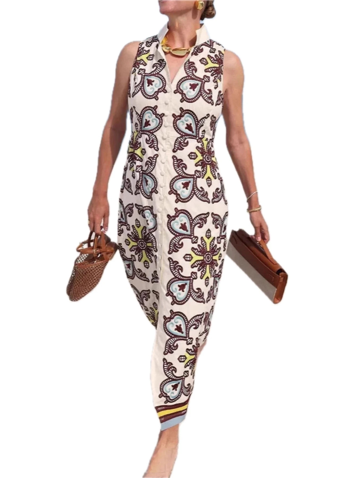 Women's Printed Button Front Sleeveless Dress with Slit for Everyday Wear Fabric 100% Polyester Lightweight Comfort