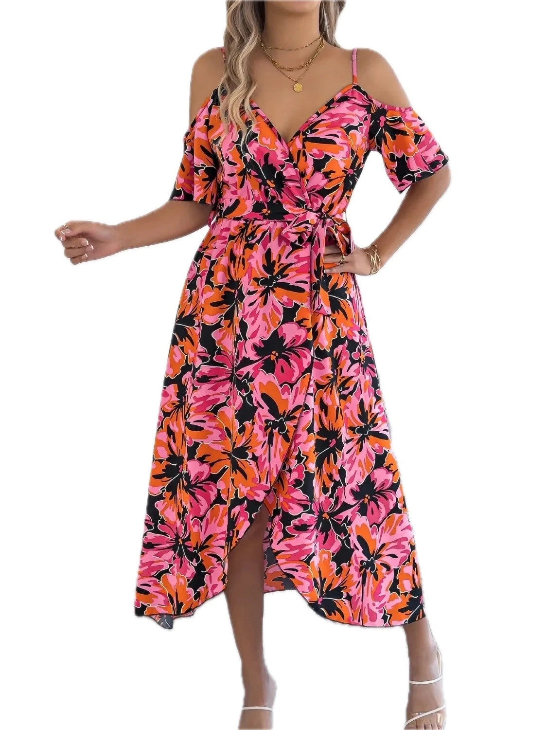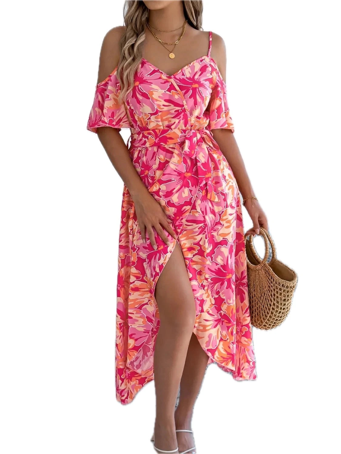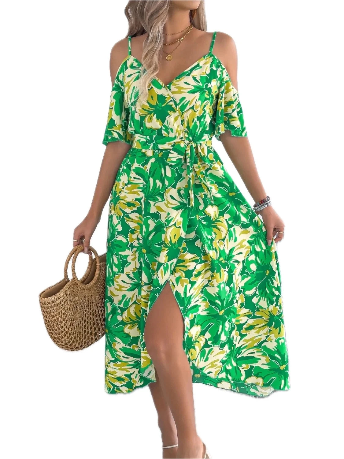 Women's Printed Cold Shoulder Midi Cami Dress with Tie Front and Front Slit for Summer Party Look 100% Polyester Fabric