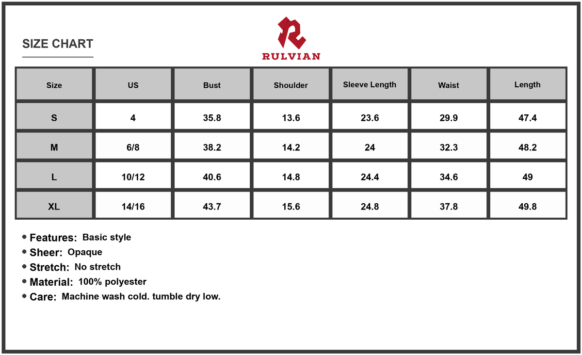 Size | US | Bust | Shoulder | Sleeve Length | Waist | Length |