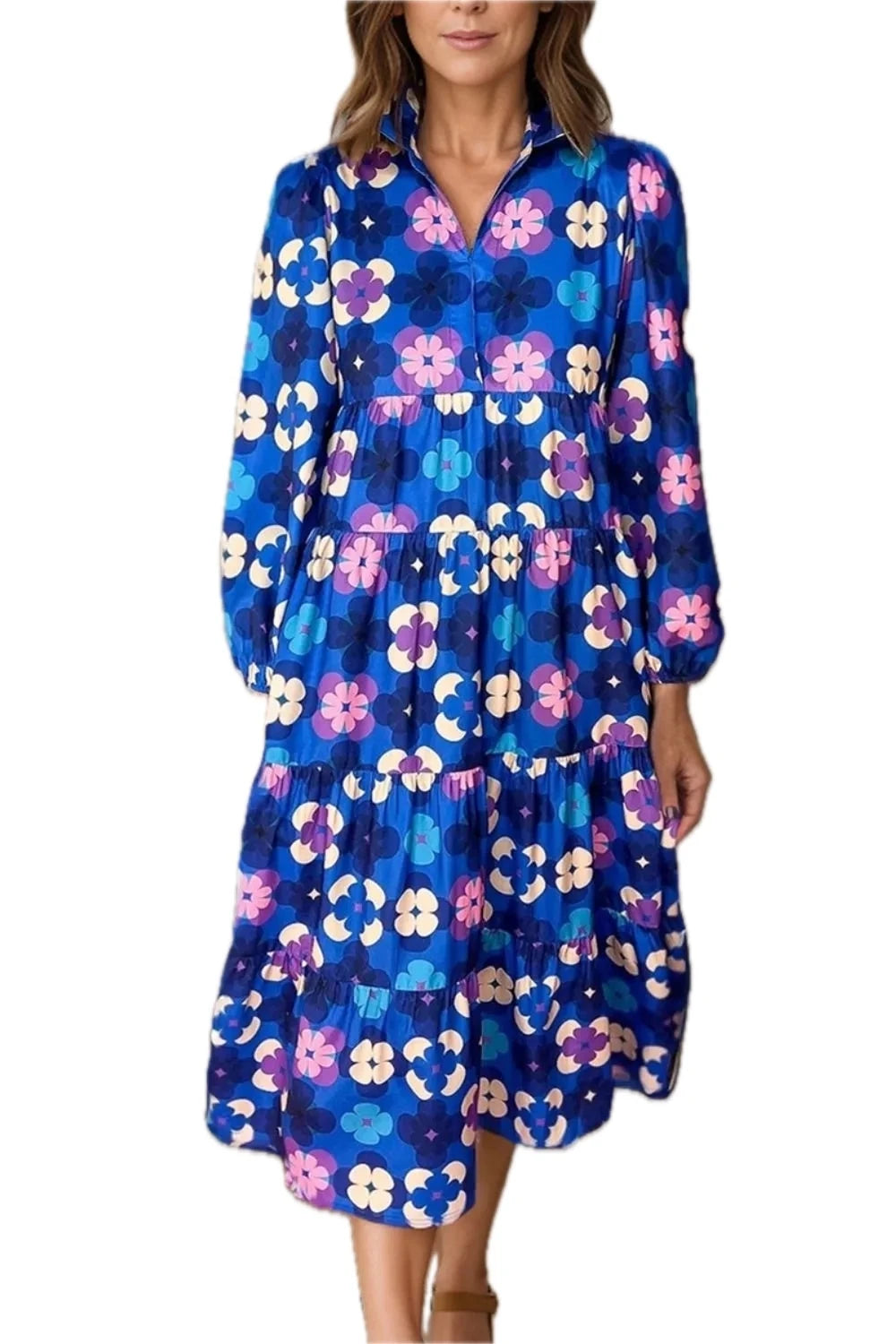 Women's Printed Collared Neck Long Sleeve Midi Dress 100% Polyester Fabric Elegant Everyday Work Outfit for All Seasons