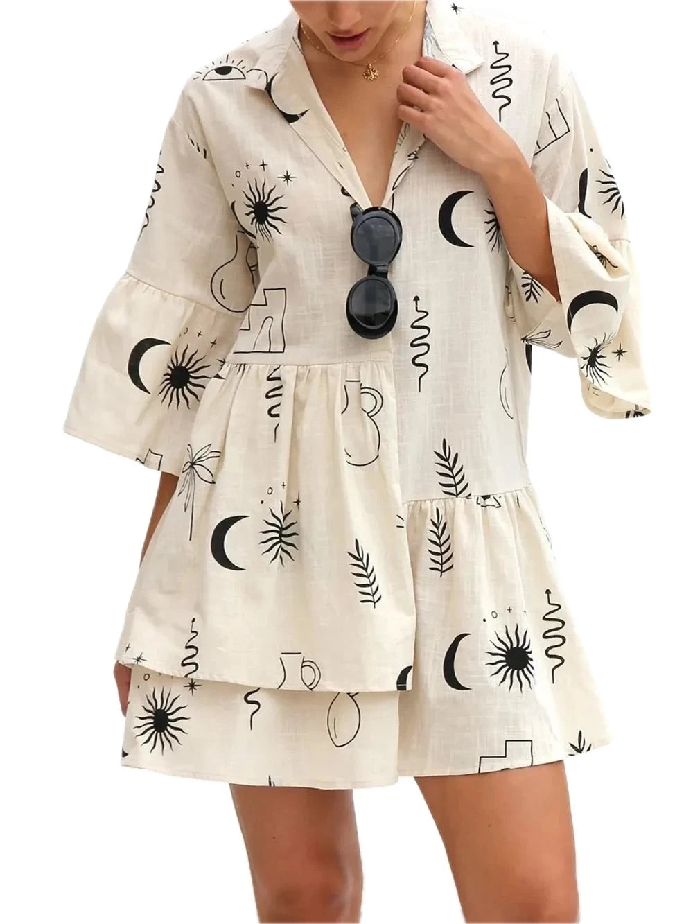 Women's Printed Collared Neck Mini Dress with Three Quarter Sleeve Button Front Ruched and Ruffled Polyester Fabric