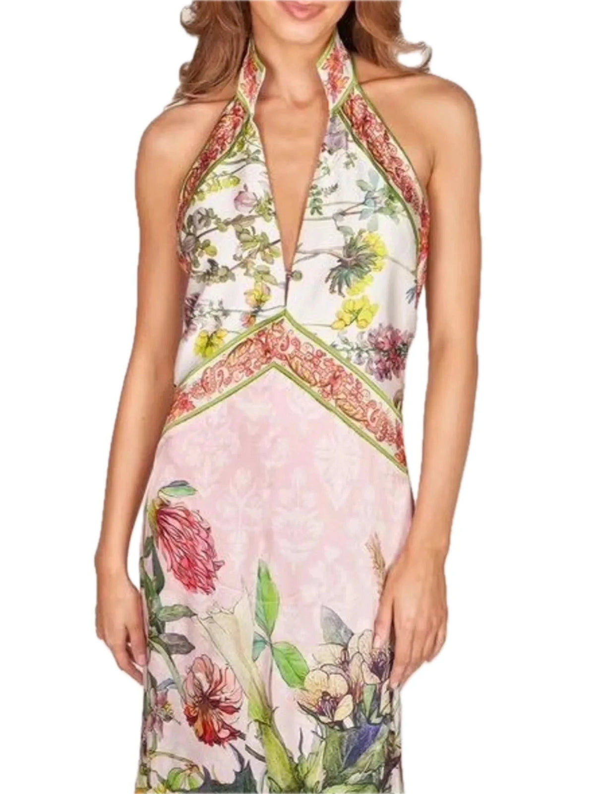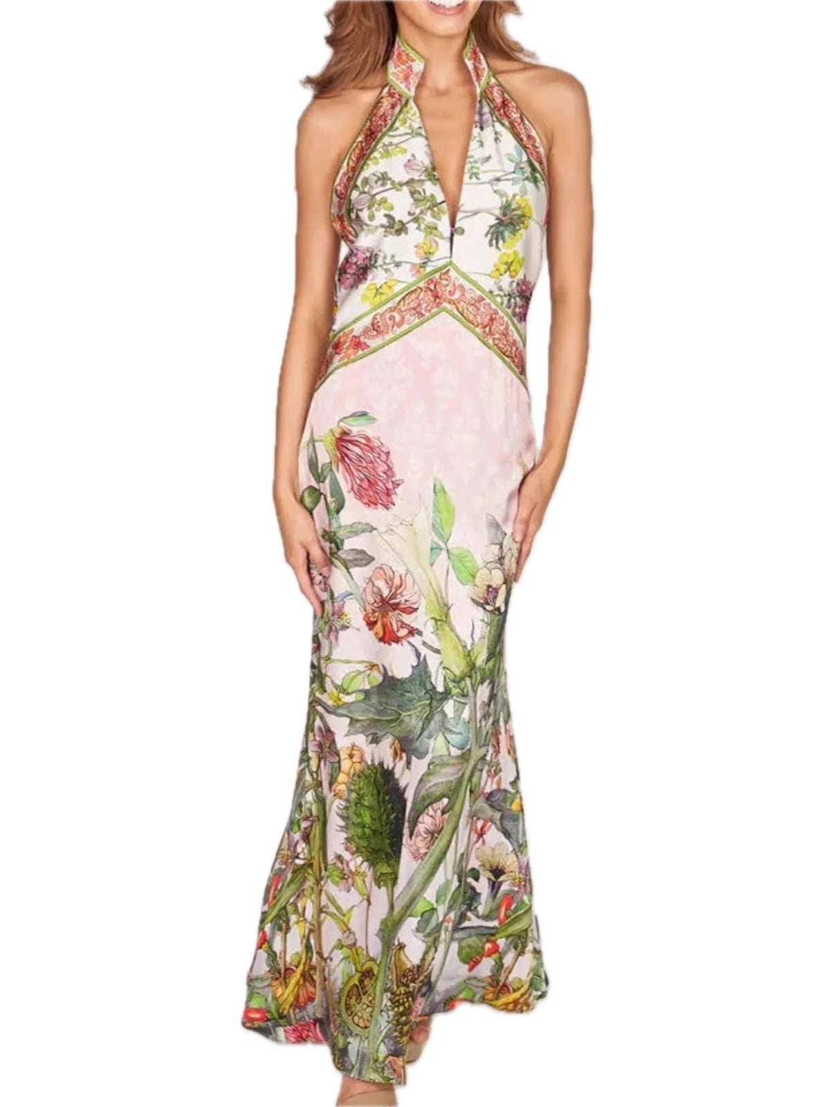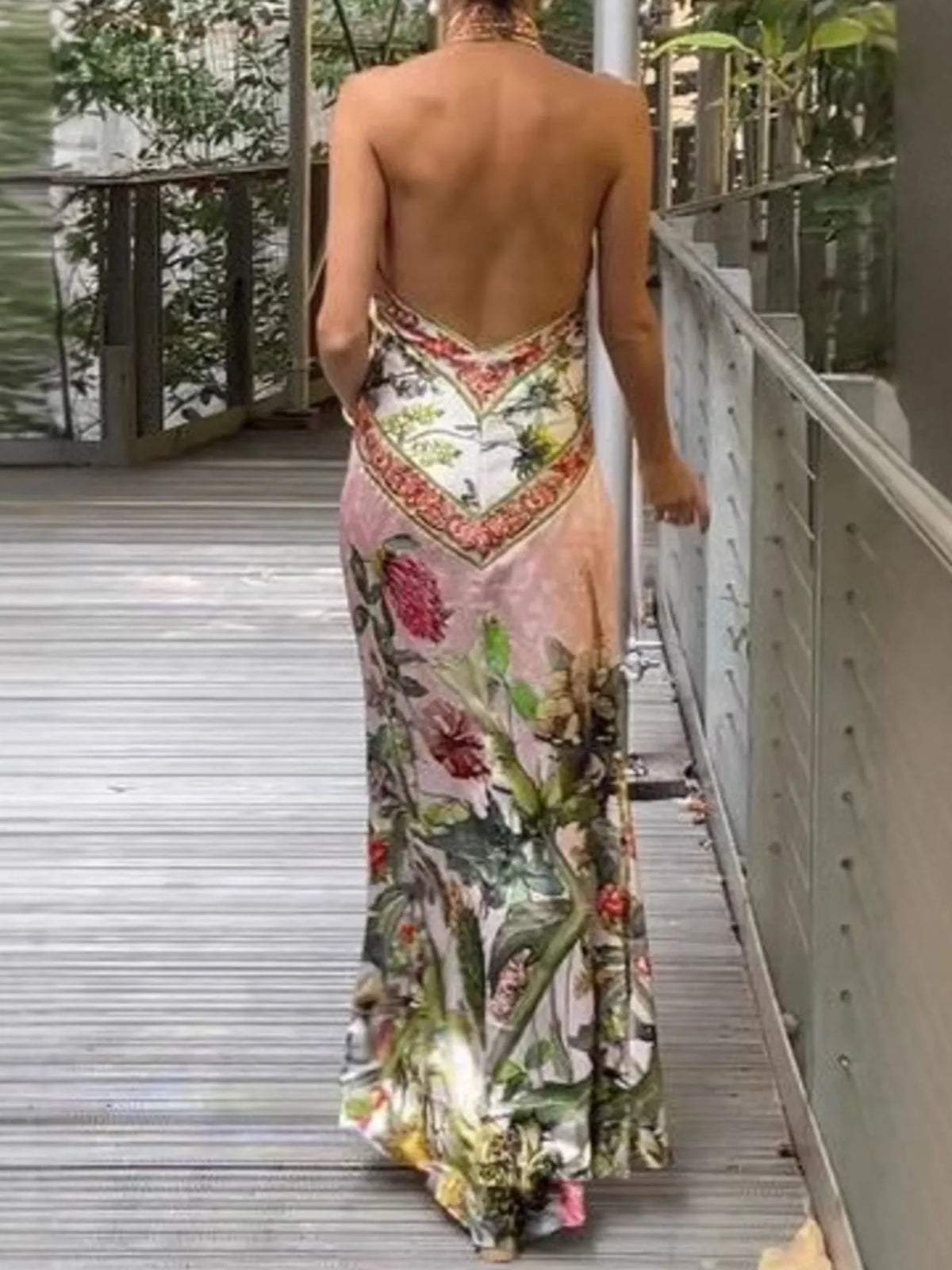 Women's Printed Halter Neck Backless Maxi Dress with Slit Stretch Fabric 100% Polyester Beach Party Vacation Wear