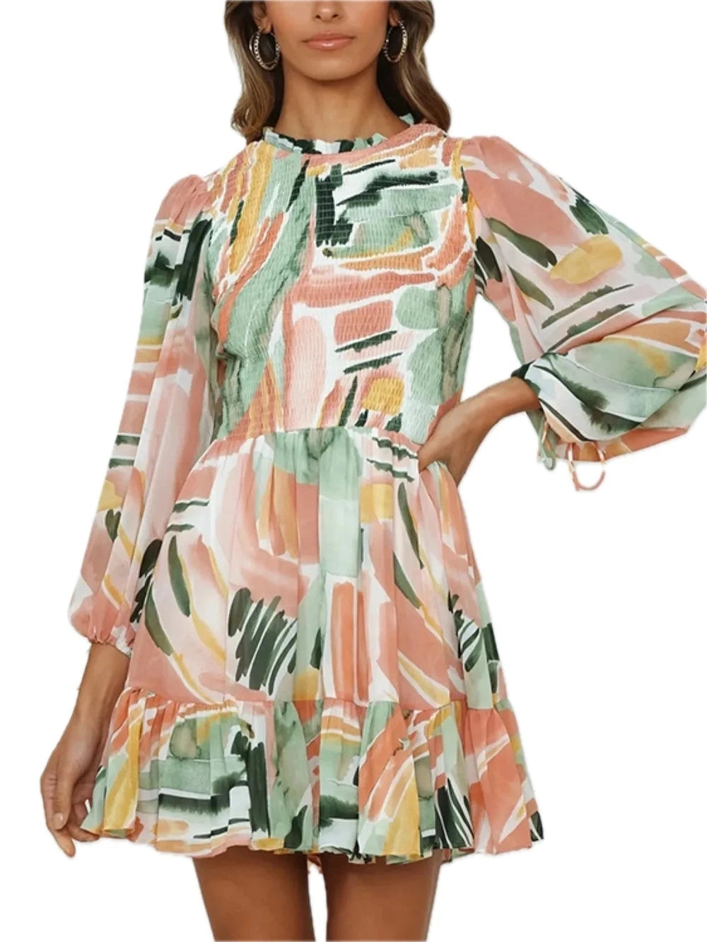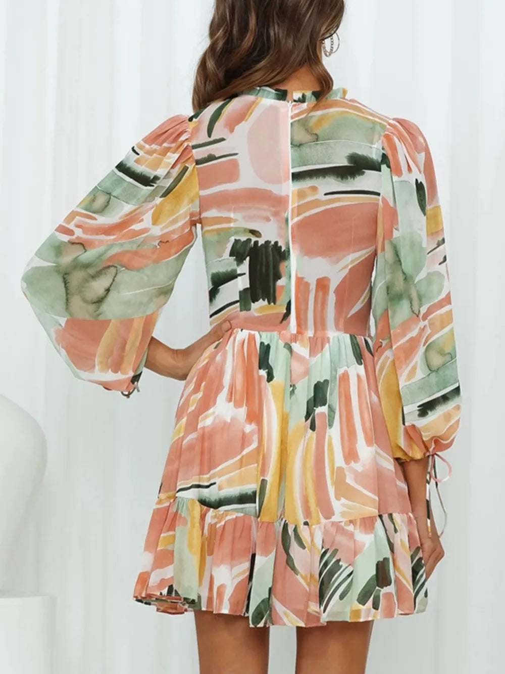 Women's Printed Mock Neck Balloon Sleeve Mini Dress 100% Polyester Lightweight Partywear Dress for Occasions Everyday