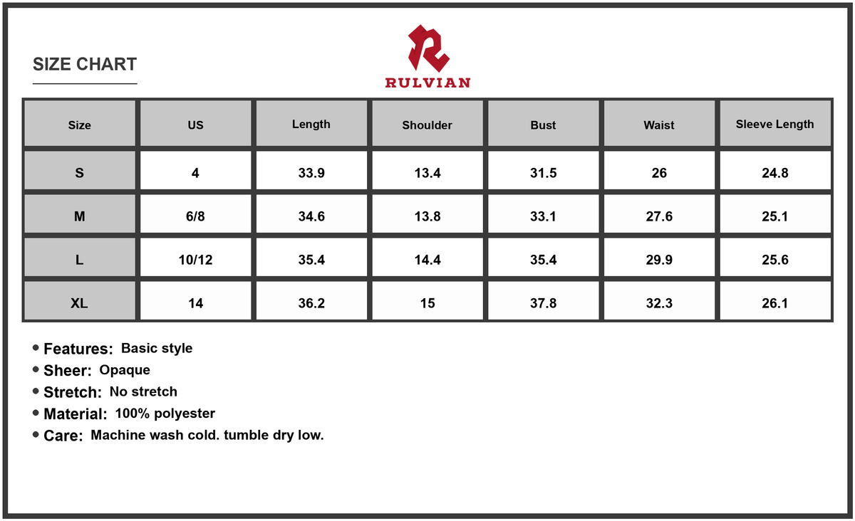 Size | US | Length | Shoulder | Bust | Waist | Sleeve Length |