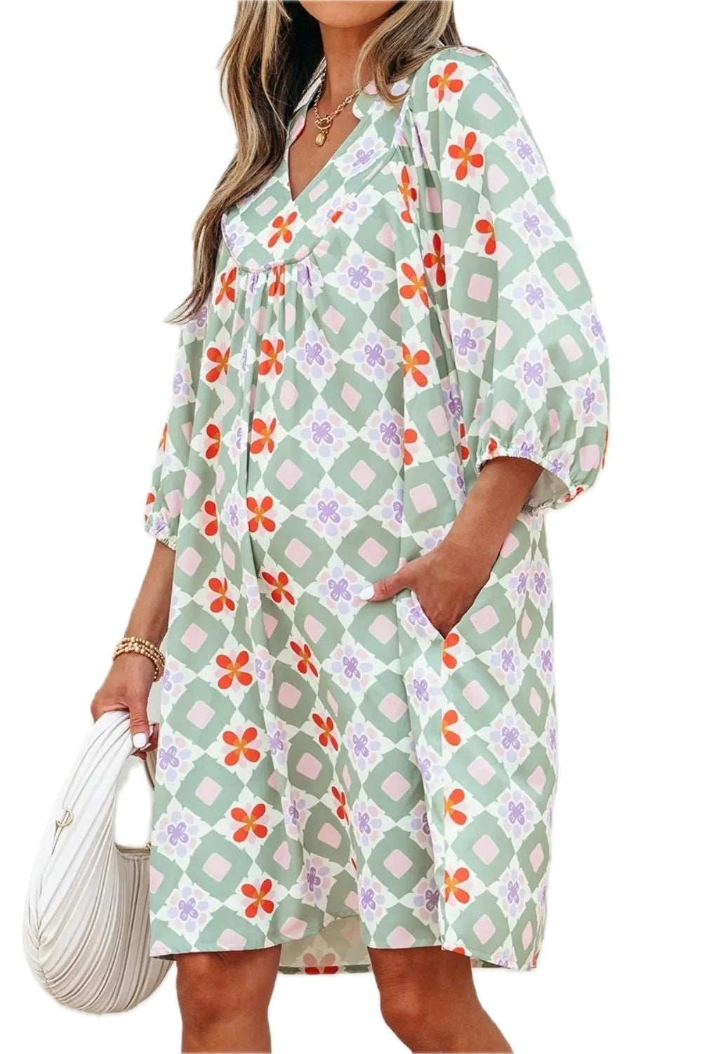 Women's Printed Notched Three Quarter Balloon Sleeves Loose Dress Polyester 100% Lightweight Casual Everyday Wear