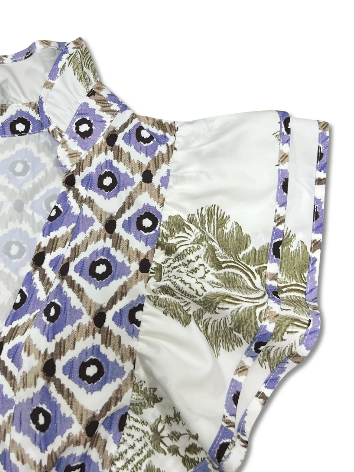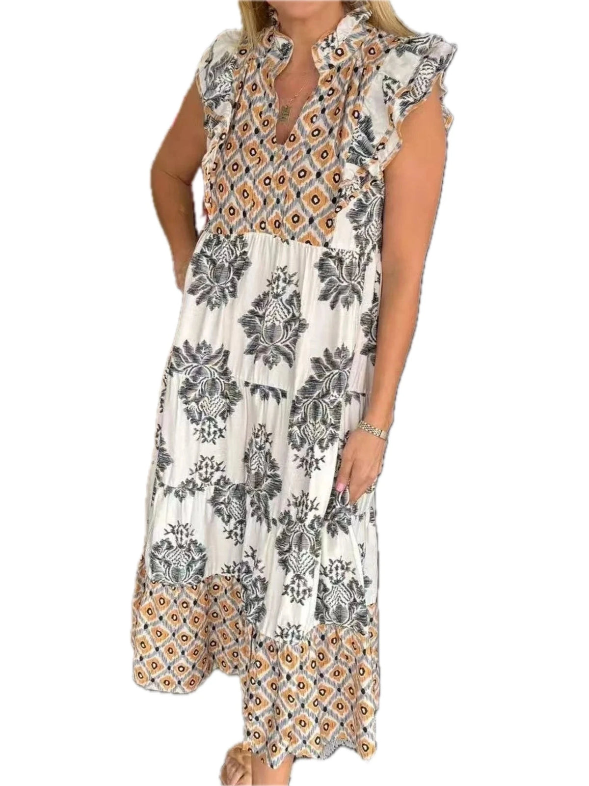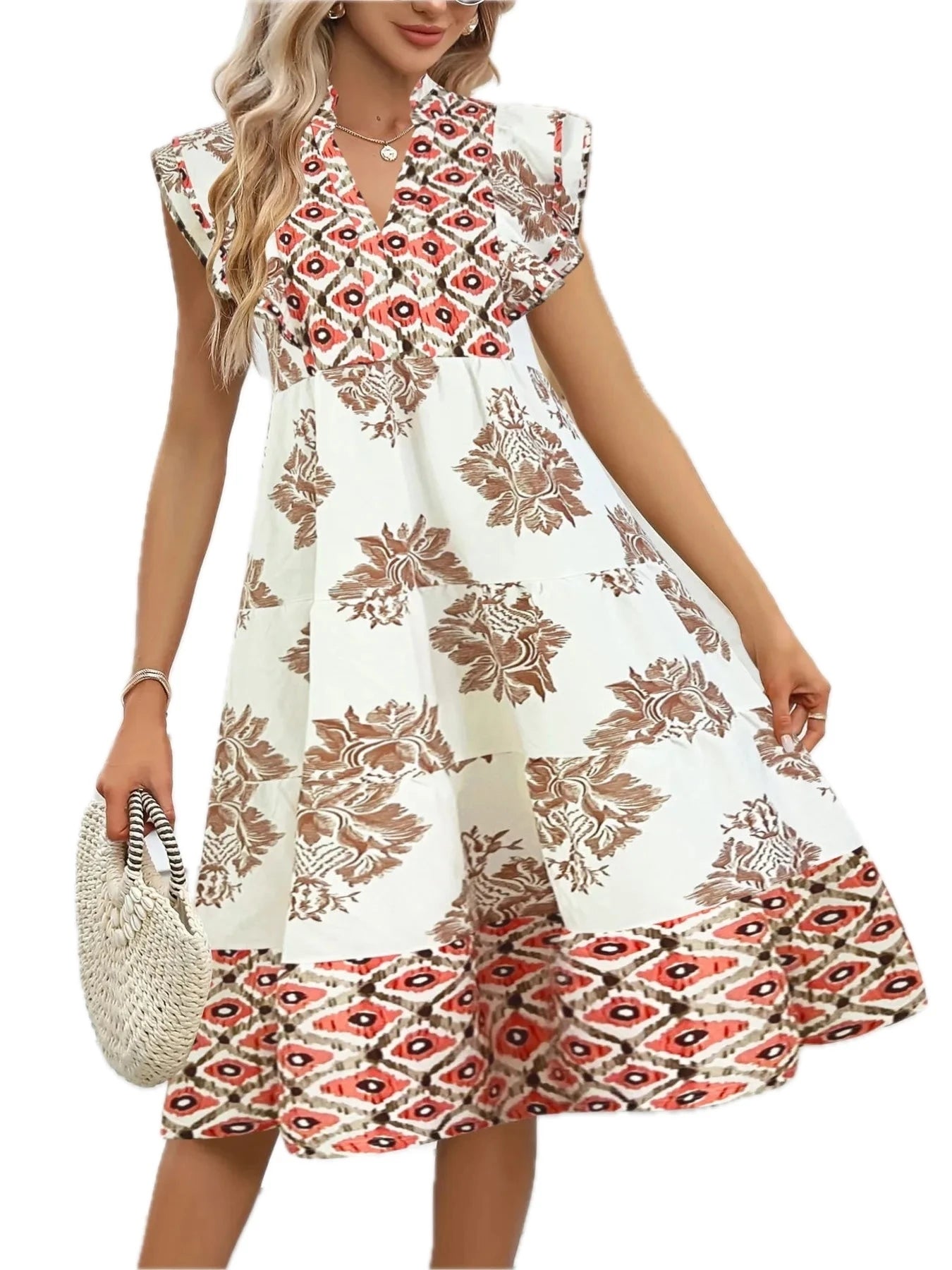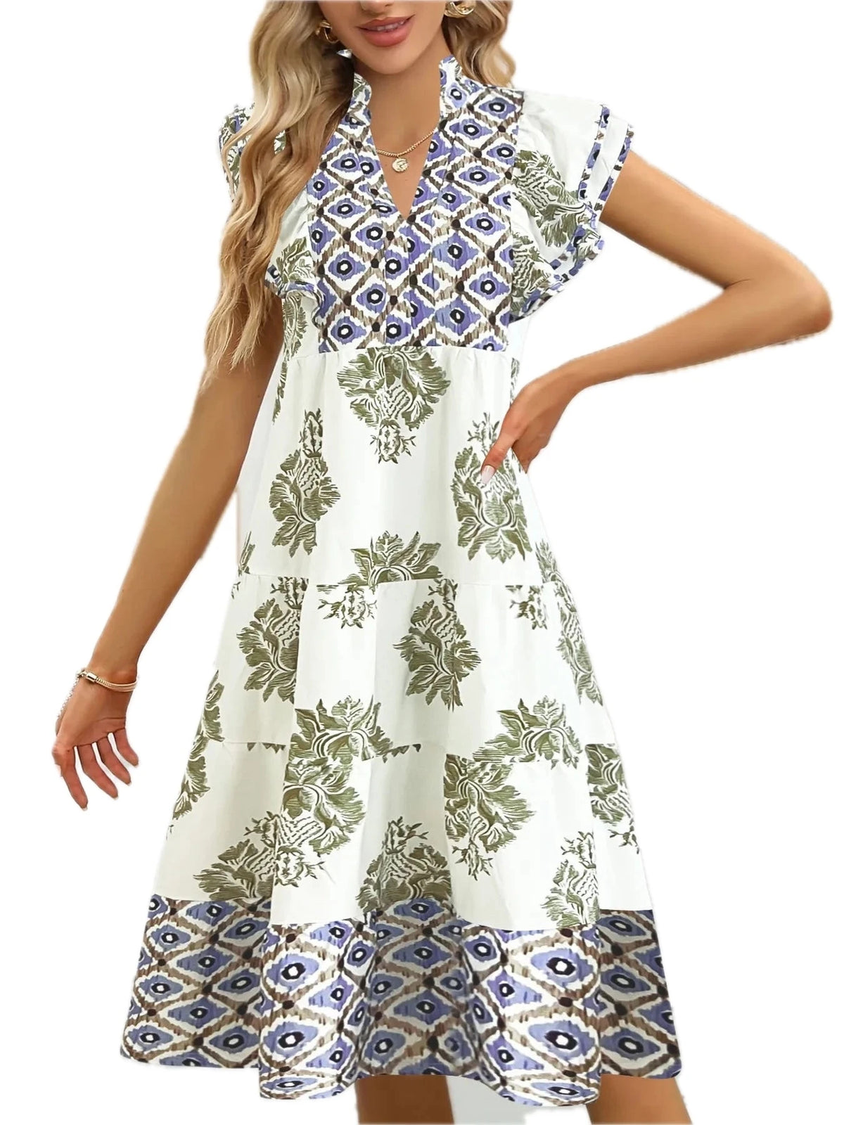Women's Printed Notched Ruffled Cap Sleeve Dress 100% Polyester Lightweight Silhouette for Everyday Wear Easy Care