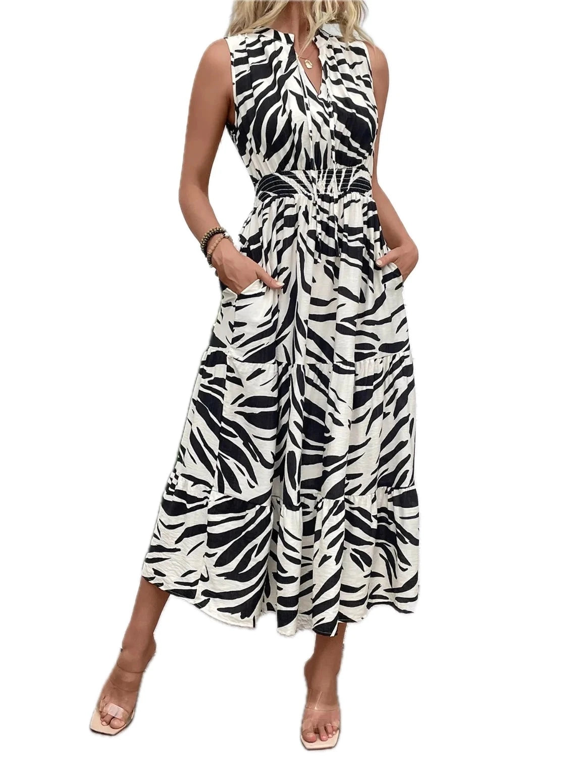 Women's Printed Notched Sleeveless Midi Dress with Pockets Tied Ruched 91% viscose 9% polyamide Soft drape everyday wear
