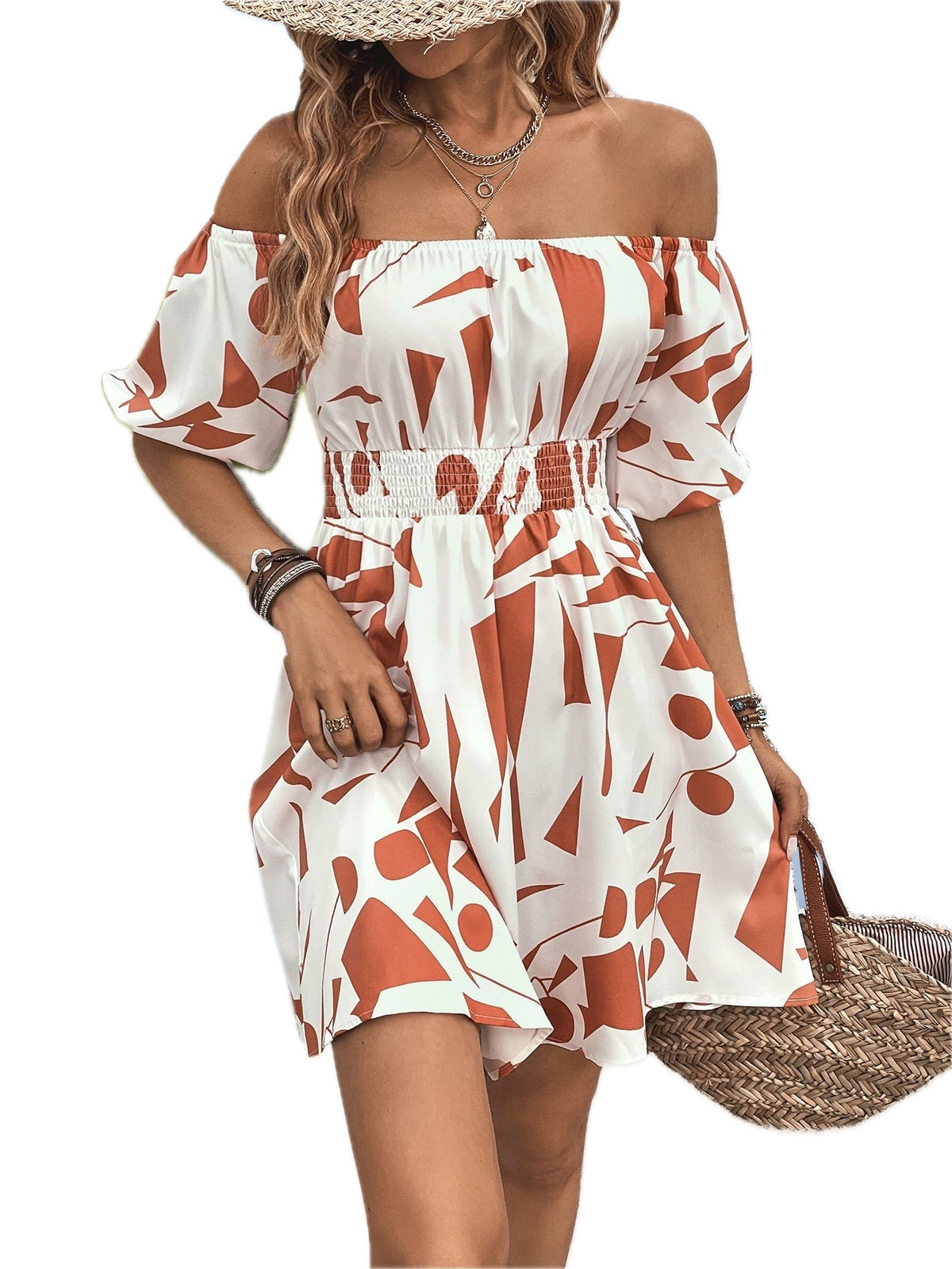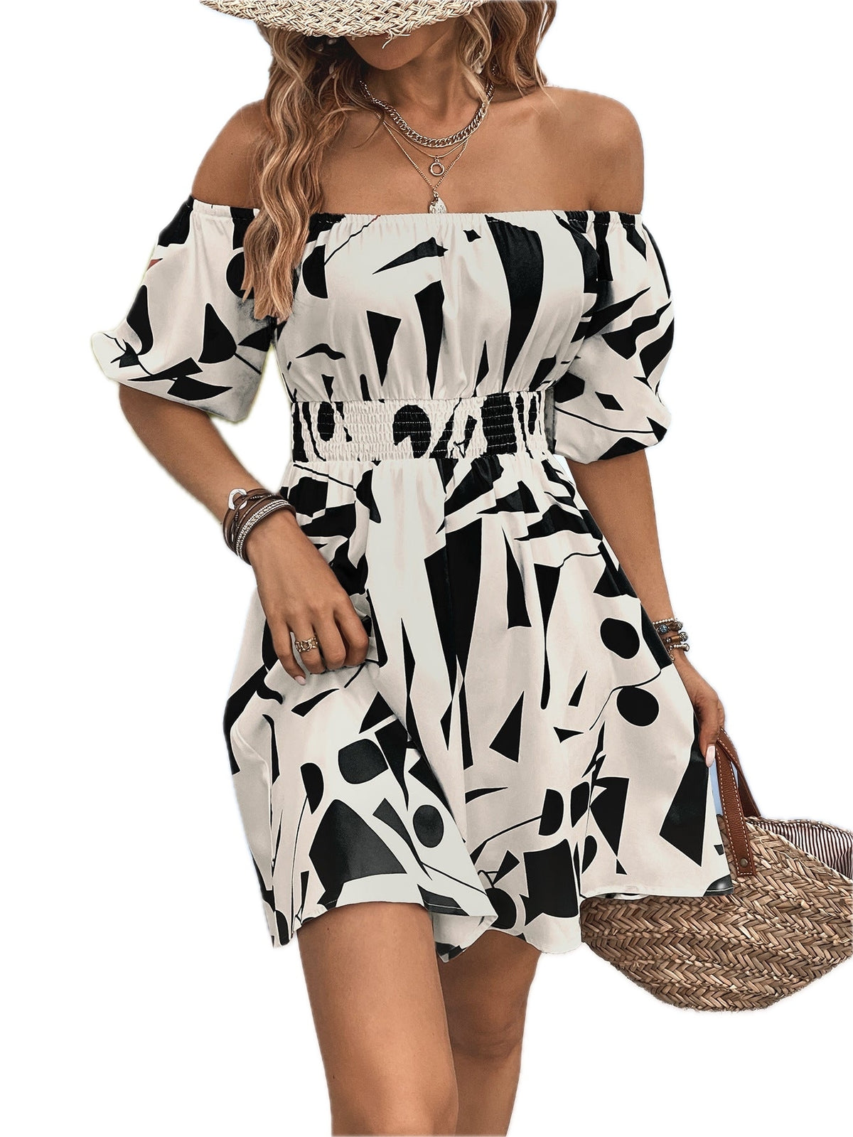 Women's Off-Shoulder Smocked Waist Dress with Balloon Sleeves Ninety Five Percent Polyester and Five Percent Elastane